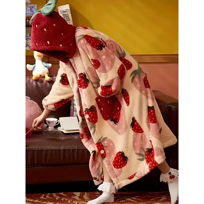 New Strawberry Women's Robe Bathrobe, Autumn Winter Coral Fleece Warm Loose Home Wear, Wearable Blanket, Perfect Gift for Girlfriend