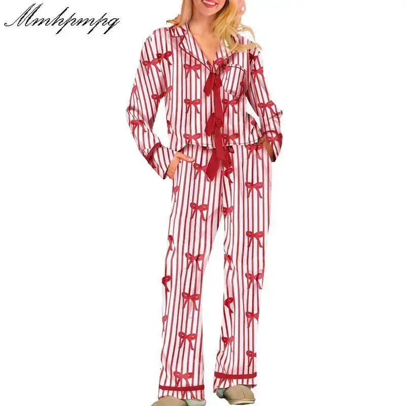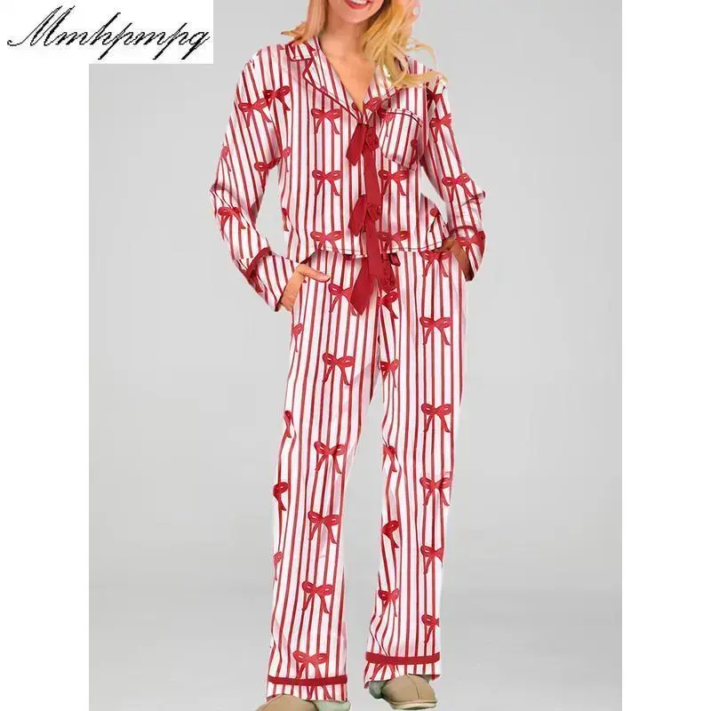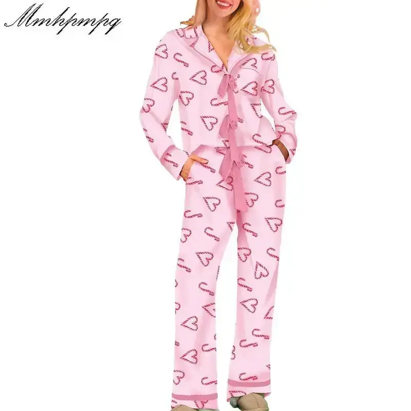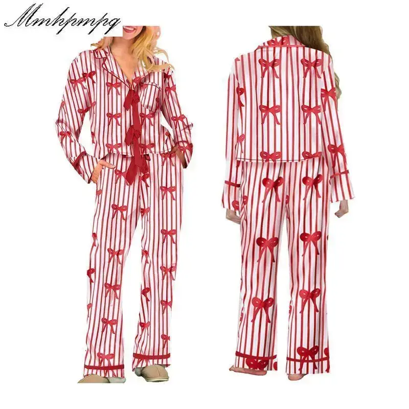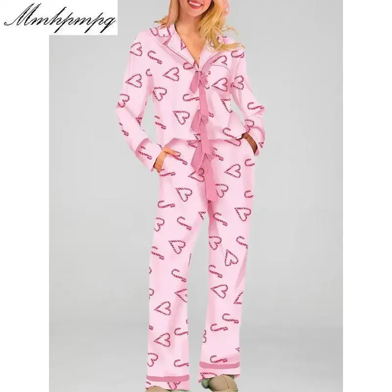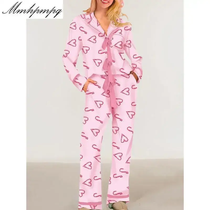 Women Pajamas Bow/Heart Print Tie Front Long Sleeve Tops and Long Pants Set Sleepwear Loungewear Womenswear Casual Check Pjs pj pants