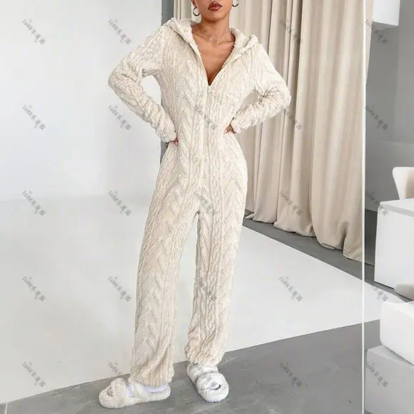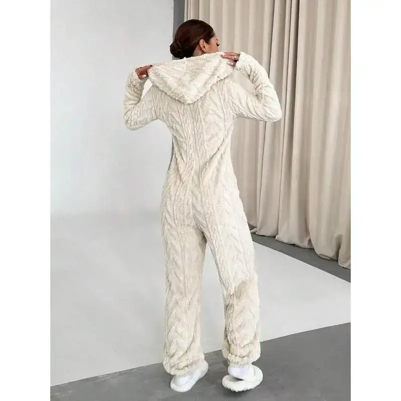 Luxurious Women's Solid Color Fleece Hooded Jumpsuit - Chic Long Sleeve Deep V-, Zip-Up, Cozy Knit Overalls Fall/Winter, Machine Washable, Indoor Clothing | Zip-up Jumpsuit | Polyester Jumpsuit