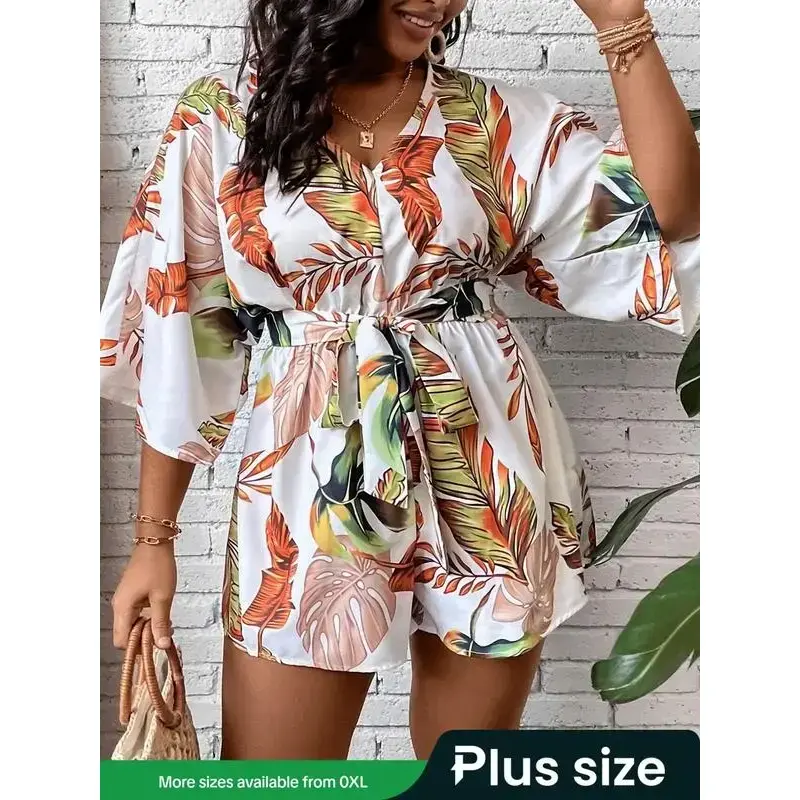 Plus Size All Over Leaf Print Belted Tie Front Romper, Vacation Clothes, Casual V Neck Batwing Sleeve Romper for Beach Vacation Holiday, Women's Clothes for SummerGift