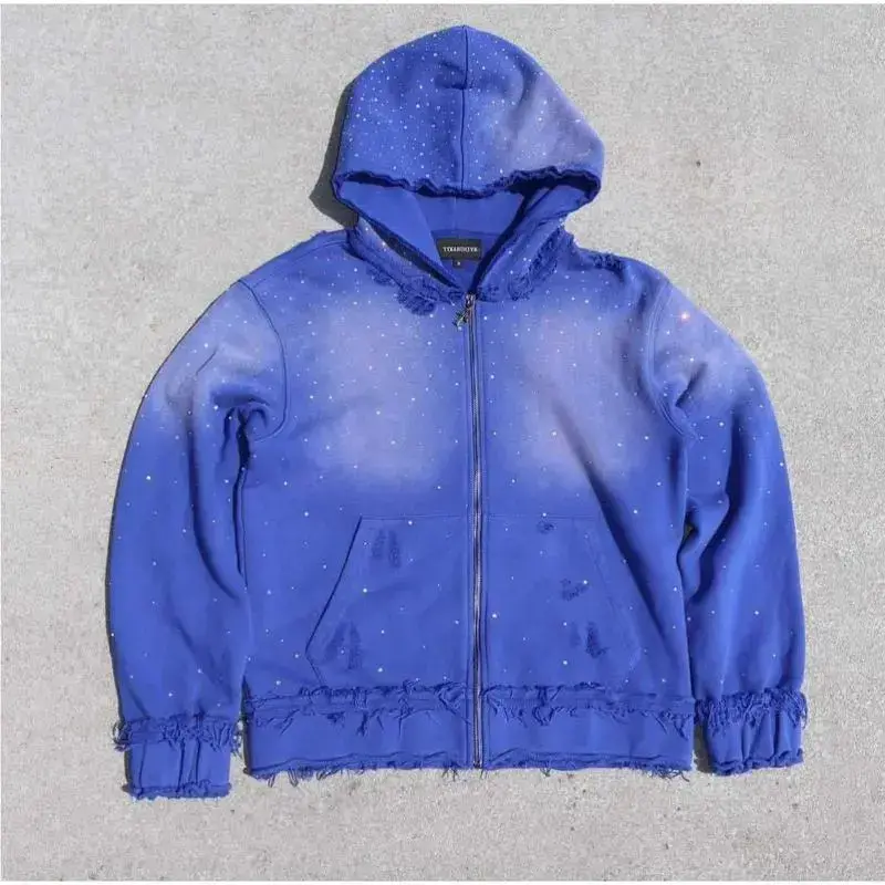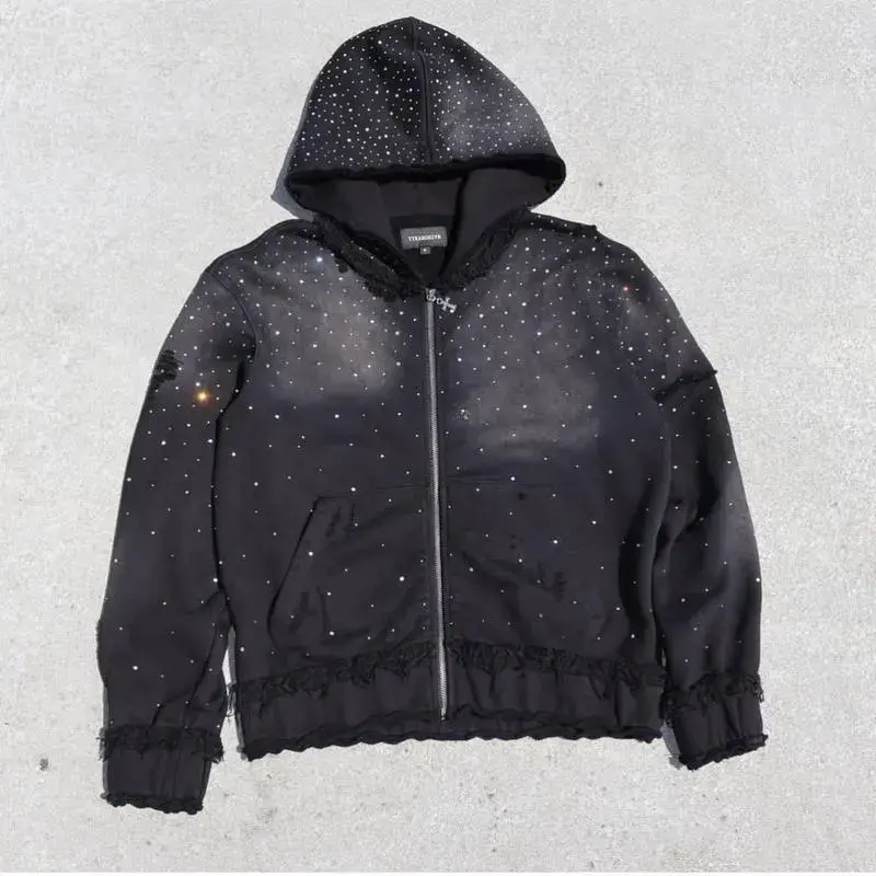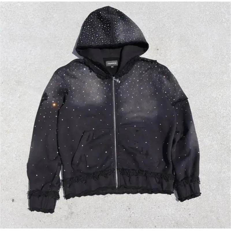 Men's Autumn Winter Trendy Starry Sky Rhinestone Hooded Zipper Sweatshirt Men's Street Hip Hop Loose Jacket