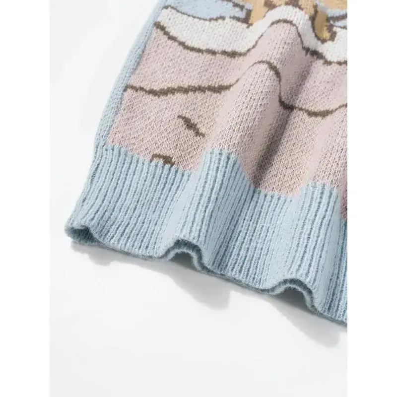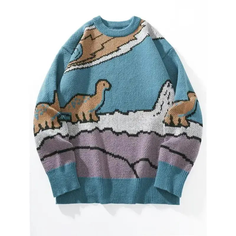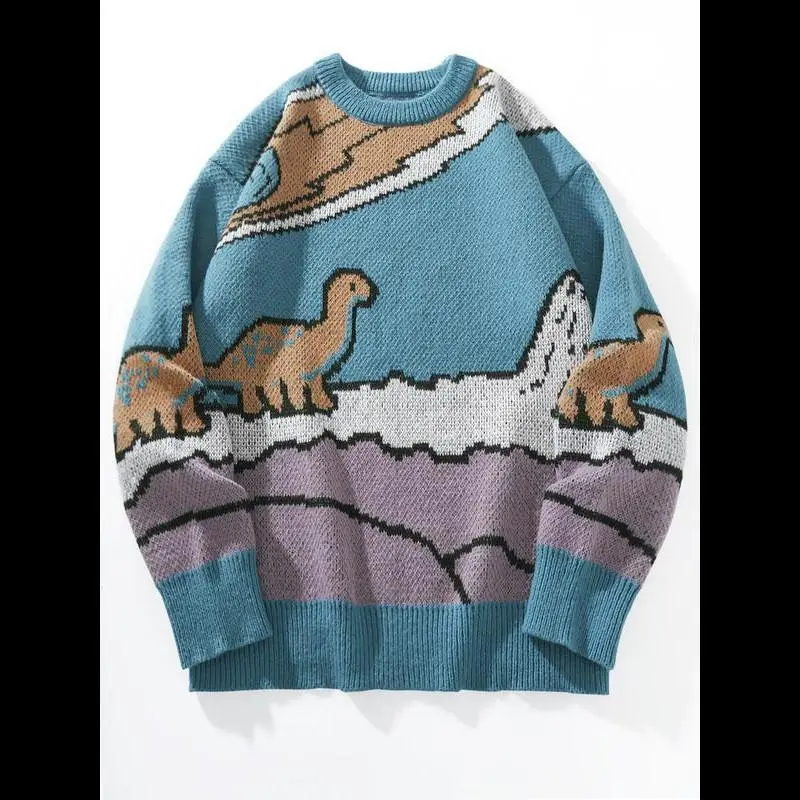 [Unique Print]: Feature an eye-catching cartoon dinosaur pattern that sets this sweater apart, making it a fun choice for urban outings and gatherings. [Medium Stretch]: The medium stretch fabric ensures a fitted look while allowing easy movement, providing a snug yet breathable fit throughout the day. [Drop Shoulder Sleeves]: The drop shoulder sleeve design offers a relaxed silhouette, enhancing mobility without restricting movement for everyday activities. [Round Neckline]: With a classic round neckline, this sweater offers a timeless aesthetic, suitable for layering or wearing alone for a refined look. [Knit Construction]: Crafted using a quality knitting method, this sweater provides durability and warmth, making it ideal for the colder fall and winter seasons.