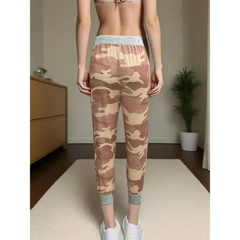 Women's Camo Print Harem Pants - Smooth Polyester Micro Elasticity, Casual High Drawstring Waist Crop Joggers with Pockets | Machine Wash | No Lining
