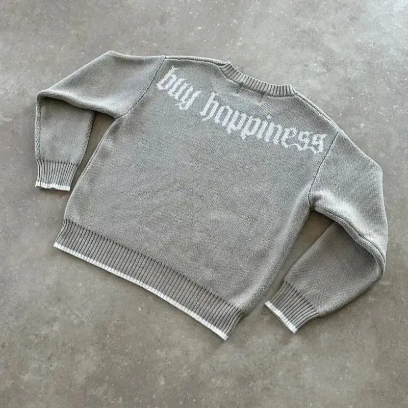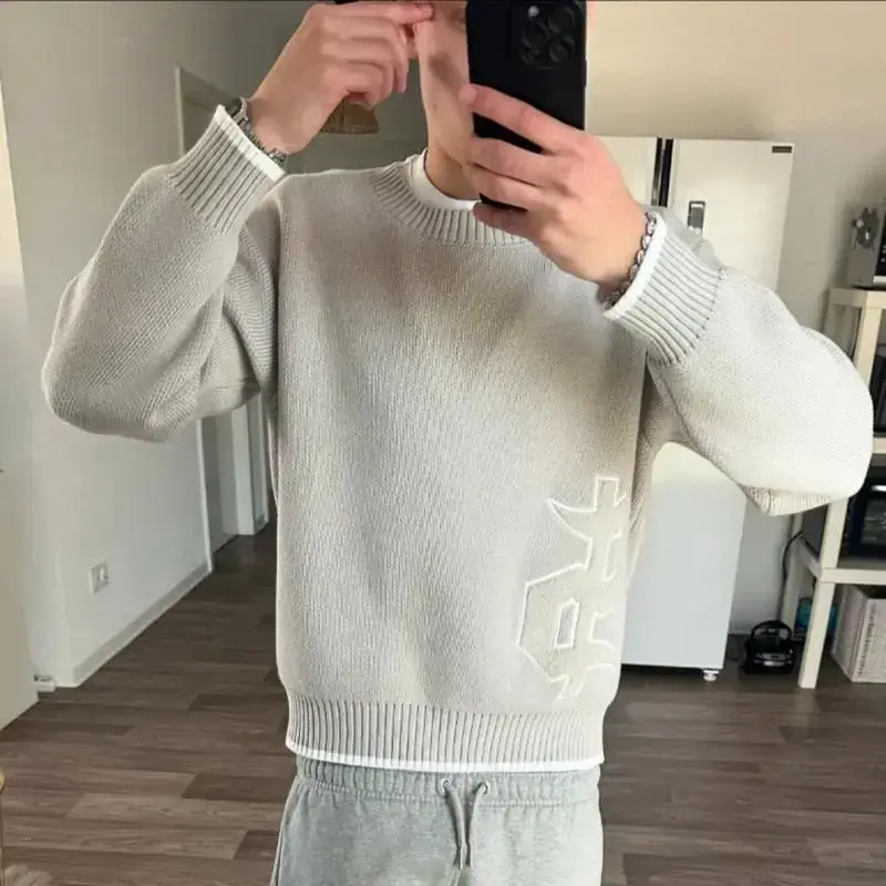 Y2K Round Neck Gray Knitted Sweater New Popular Symbol Pattern Retro Pullover Autumn Winter Warm Boxy Men's Clothing