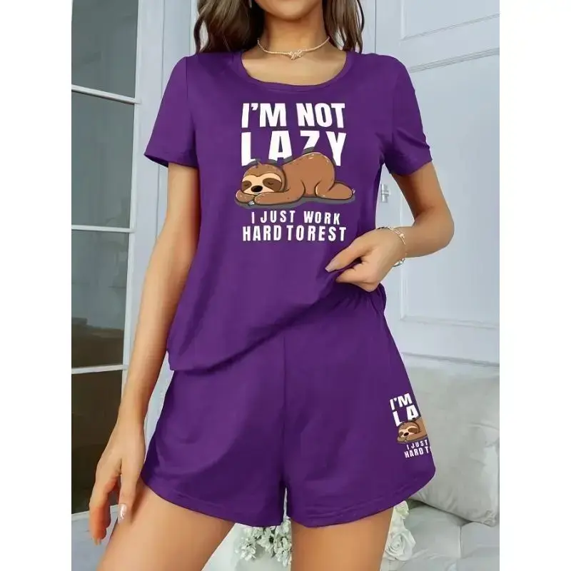 Women's Cute Sloth & Slogan Print Pajama Set, Short Sleeve Round Neck Top & Shorts, Comfortable Relaxed Fit