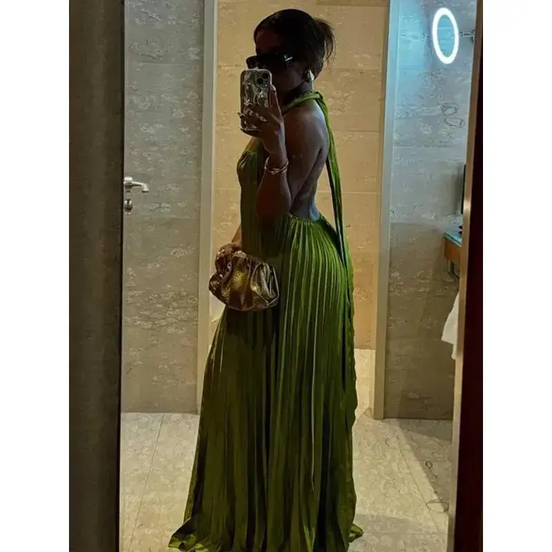 Green Evening Dresses Woman Elegant Sexy Summer Pleated Dress Hollow Out Lady Halter Neck Backless Dress Wholesale Drohipping