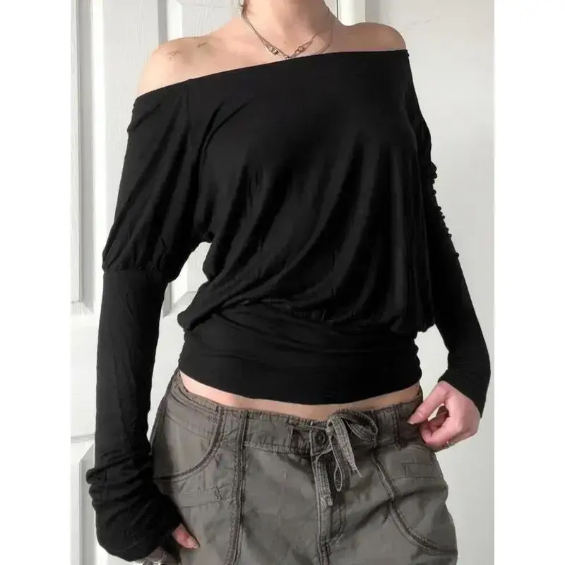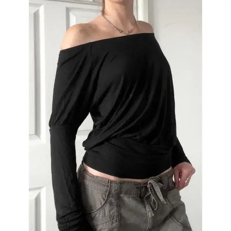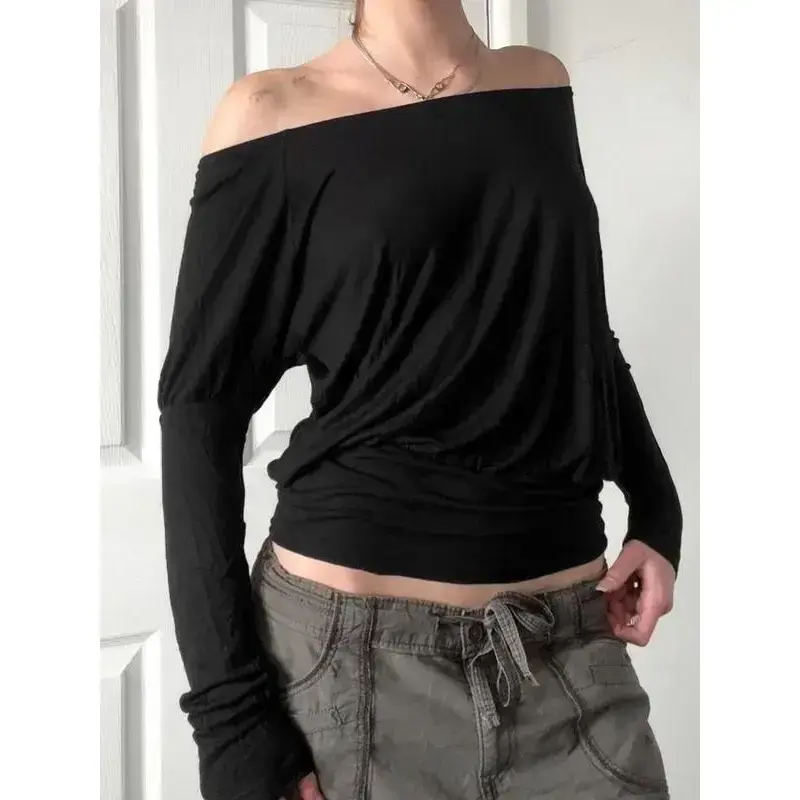 【Unique Batwing Sleeves】: The distinctive batwing sleeves provide an eye-catching silhouette, setting this top apart from standard designs in the category. 【Off-Shoulder Style】: This top features an off-shoulder cut, lending a modern twist while maintaining a relaxed fit for daily wear. 【Moderate Fabric Thickness】: Crafted from moderately thick fabric, this top offers an optimal blend of warmth and breathability for spring and fall. 【Plain Pattern】: Featuring a sleek plain pattern, it serves as a minimalistic staple that pairs effortlessly with various outfits. 【Loose-Fitting Cut】: Designed with a loose-fitting silhouette, this top ensures freedom of movement, making it suitable for relaxed occasions.