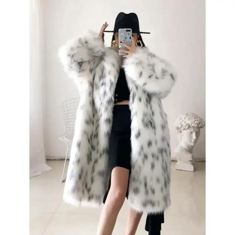 2025 New Custom W Outerwear omen's Imitation Fox Fur Coat Thick Loose Lapel Top Fabric Womenswear Womenswear White Black Spots White Black Spots Fabric Jackets Long Sleeves