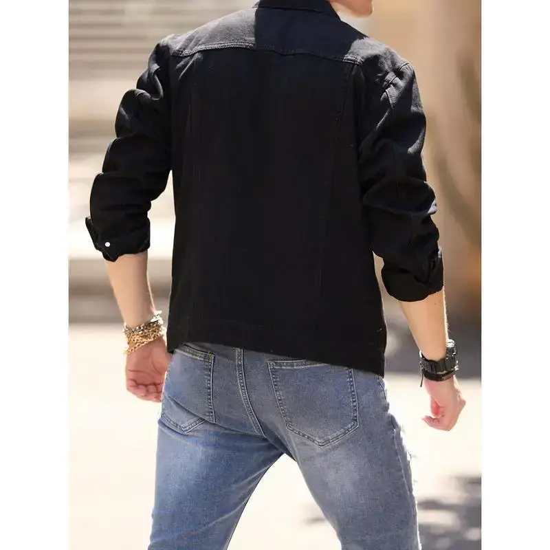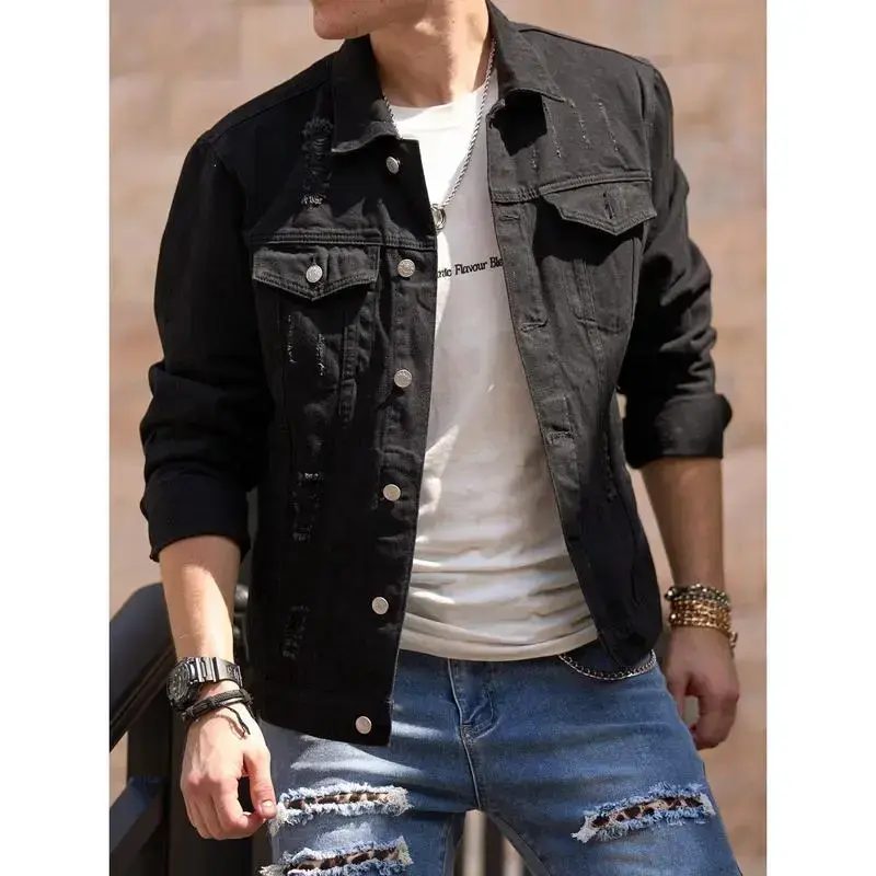 Men's Denim Jacket Streetwear Solid Slim Ripped Distressed Male Casual Coat Menswear Tops Long Sleeve Beige Plain Collared Collar Longsleeves