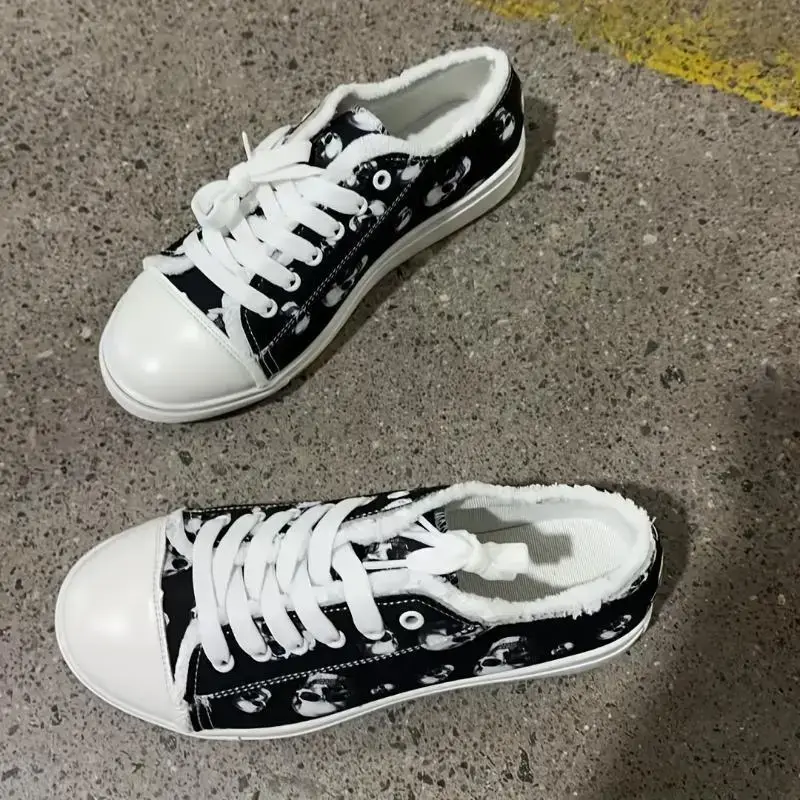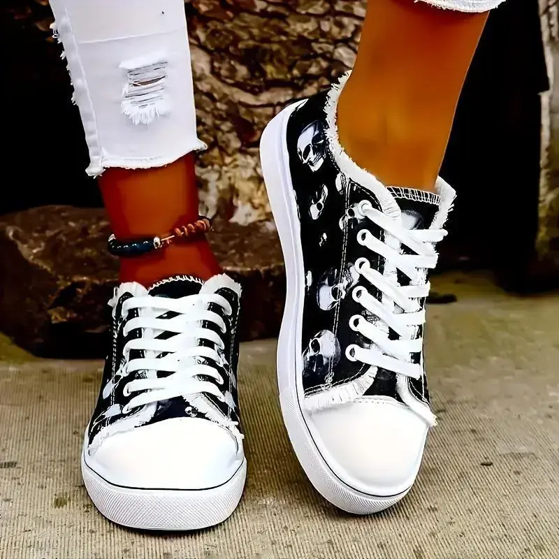 Women'S Lightweight Casual Sneakers with Skull & Floral Print - White & Black Low-Top Lace-Up Shoes, Breathable Fabric Upper, Cushioned Support, All-Season Comfort for Casual Attire, Casual Footwear | Skull Print Shoes | Cushioned Comfort