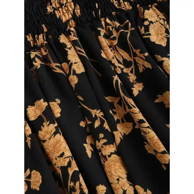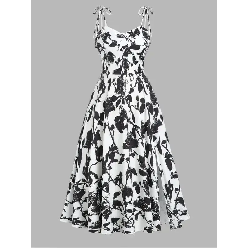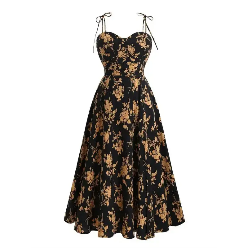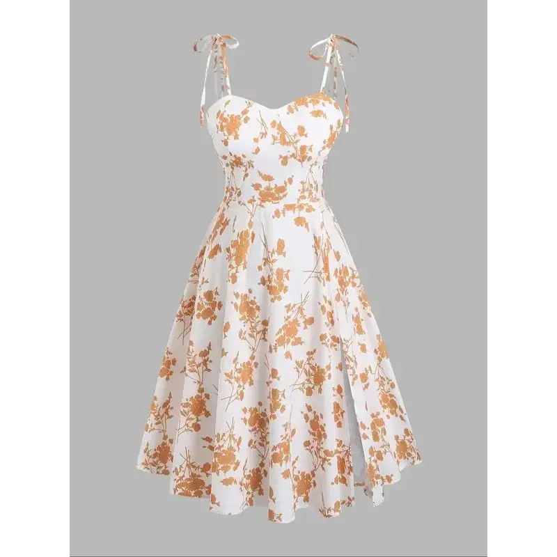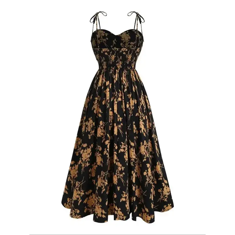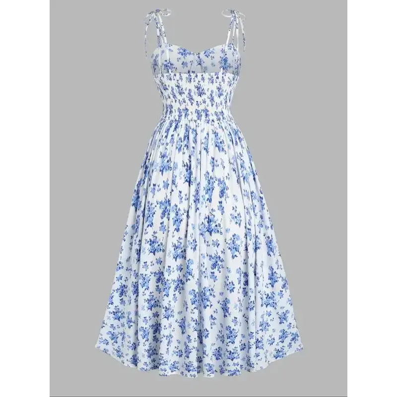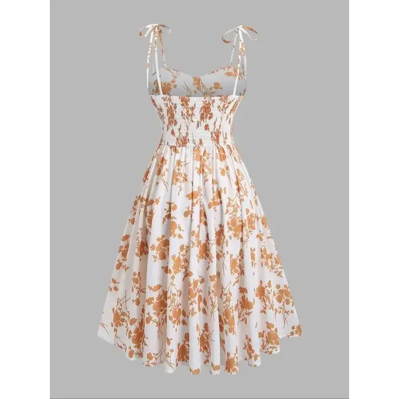 【Plus Size】 Floral Print Shirred Backless Tie Shoulder Cami Dress, Boho Sleeveless Spaghetti Strap A-line Dress for Beach Holiday Vacation, Women's Clothes for Summer, Casual Cami Dress(gift)