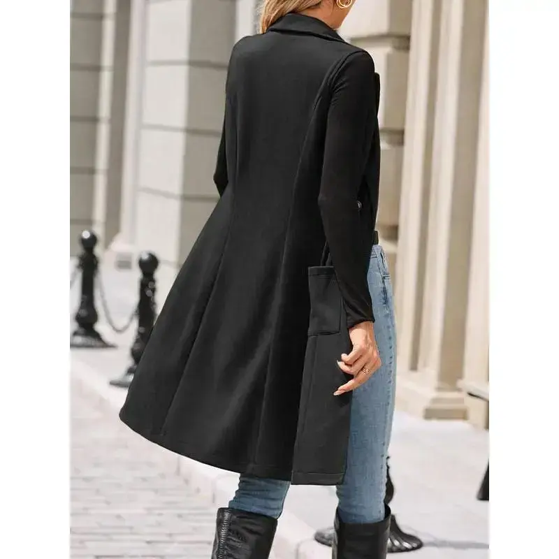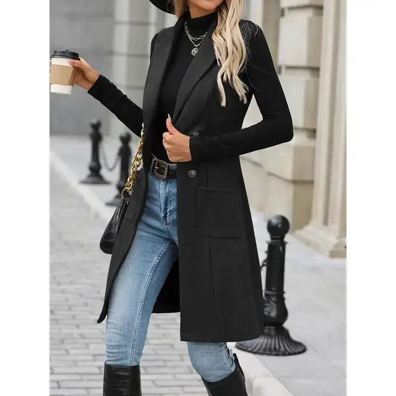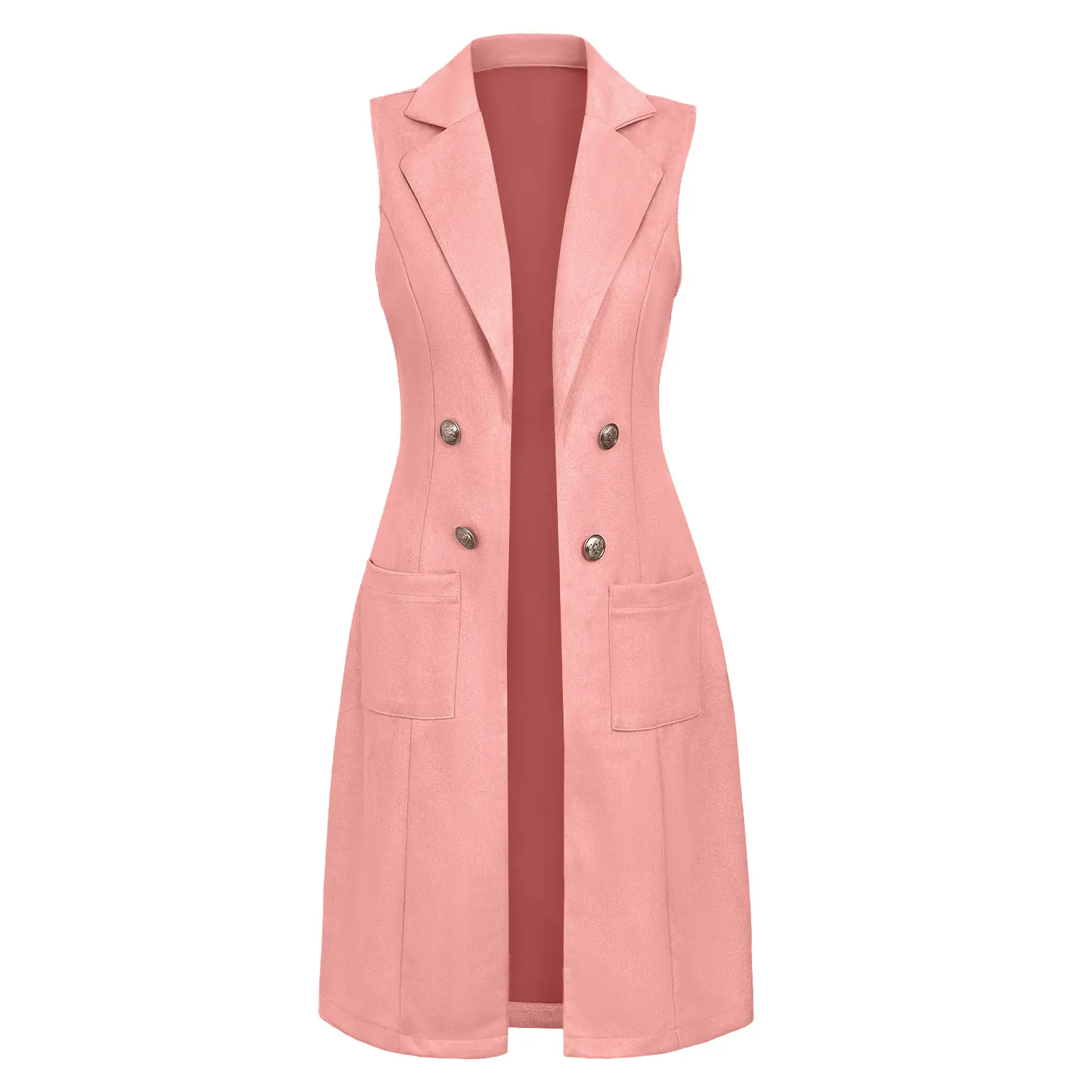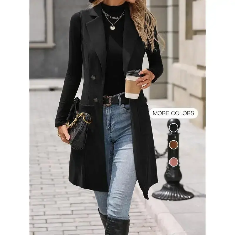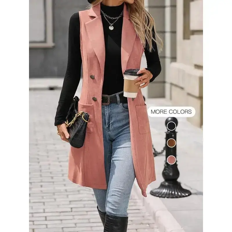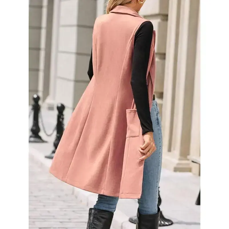 Women's Solid Button Decor Lapel Neck Suede Vest Blazers, Casual Fit Sleeveless Pocket Open Front Longline Outerwear for Spring & Fall, Ladies Clothes for Daily Wear, Minimalist Aesthetic Womenswear, Trendy Blazer