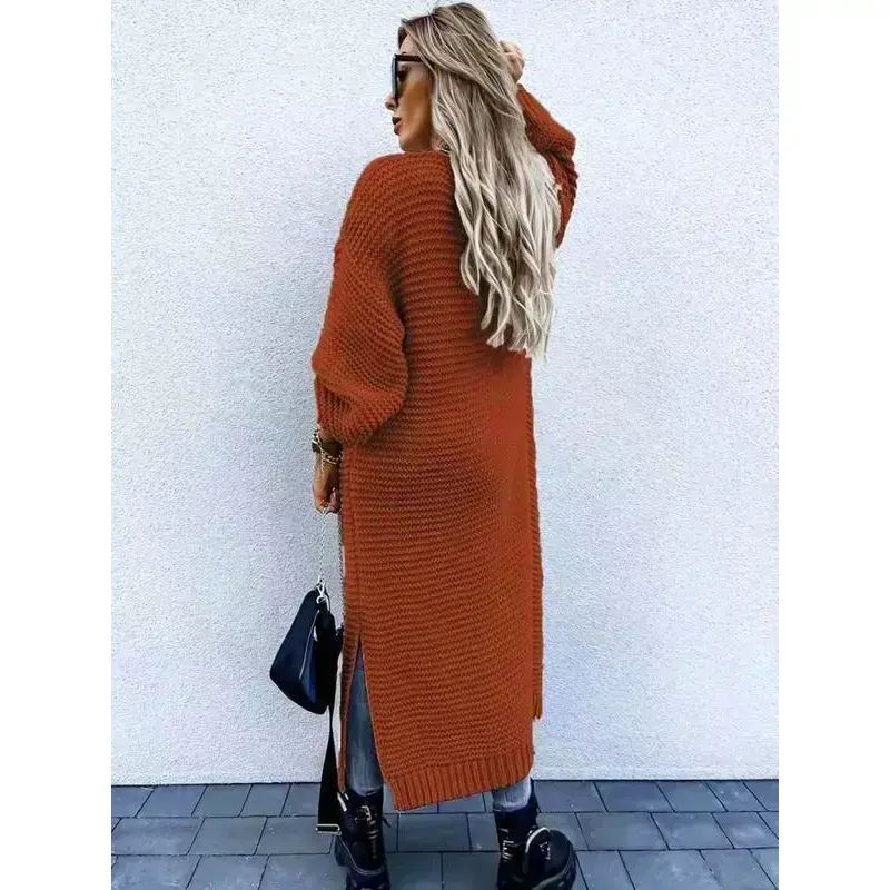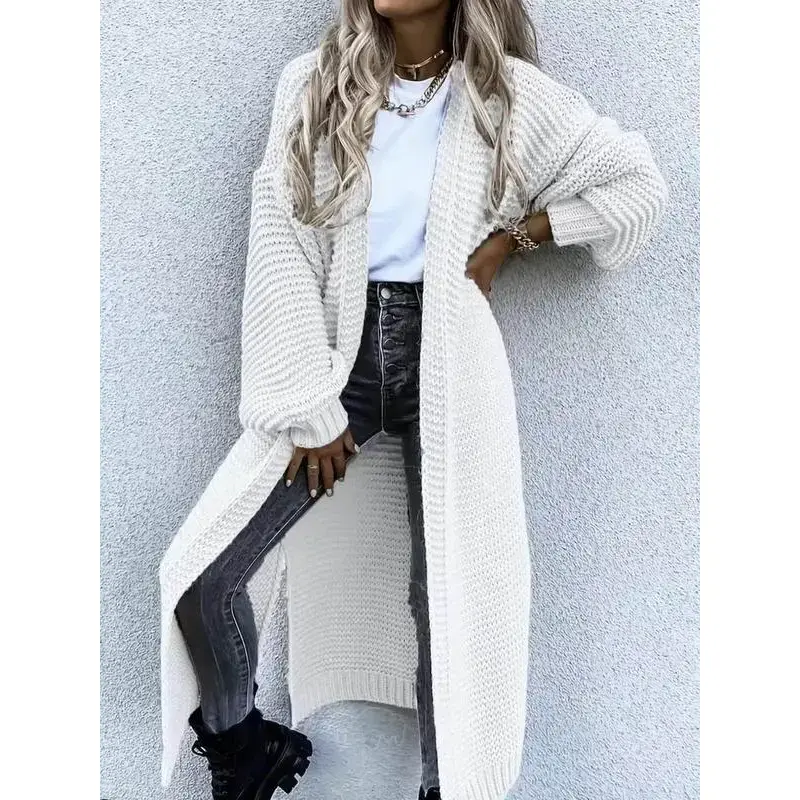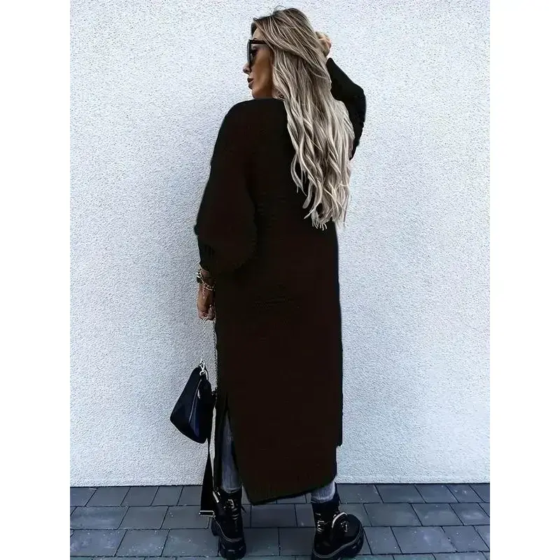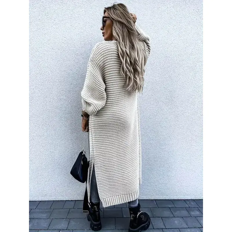 Women's Solid Color Drop Shoulder Split Hem Long Cardigan, Casual Long Sleeve Open Front Knitwear for Fall & Winter, Fashion Women's Knit Clothing for Daily Wear