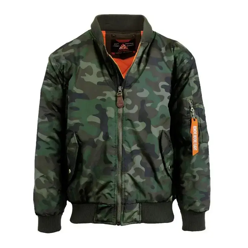Heavyweight MA-1 Flight Jacket With or Without Patches Classic Orange Lining Durable Flight Jacket Ribbed Collar, Ribbed Cuffs & Ribbed Hem 2-Front Snap Pockets 2-Interior Pockets Pen & Tool Arm Pocket Full Contrast Lining Water Resistant Shell: 100% Polyester Lining: 100% Polyester Fill: 100% Polyester Care instructions: Machine Wash Cold, Hang Dry