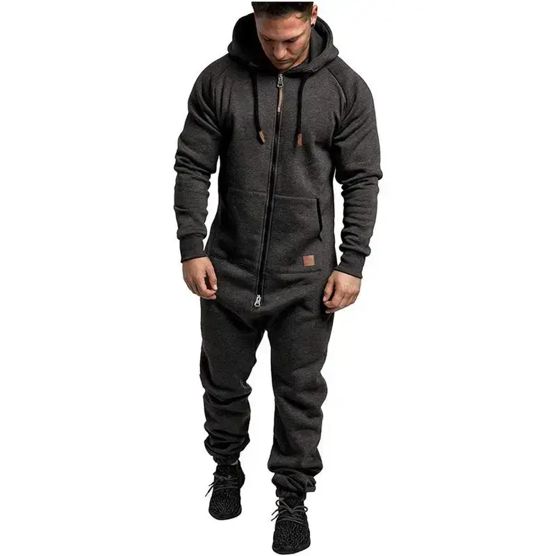 New Foreign Trade Men's Hooded Fleece Jumpsuit Solid Color Color Matching Casual Men's Suits Jumpsuit
