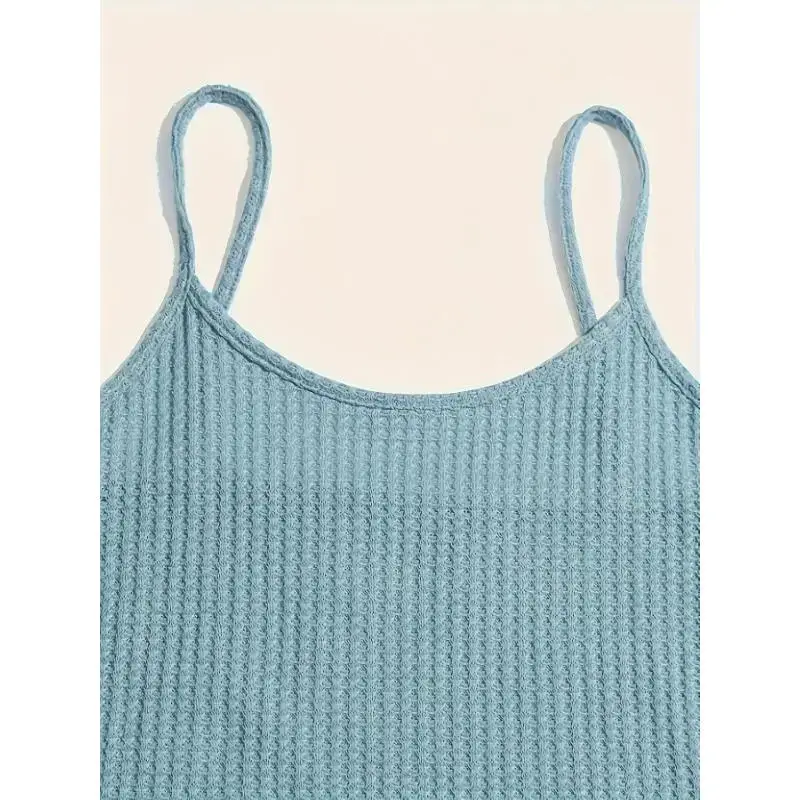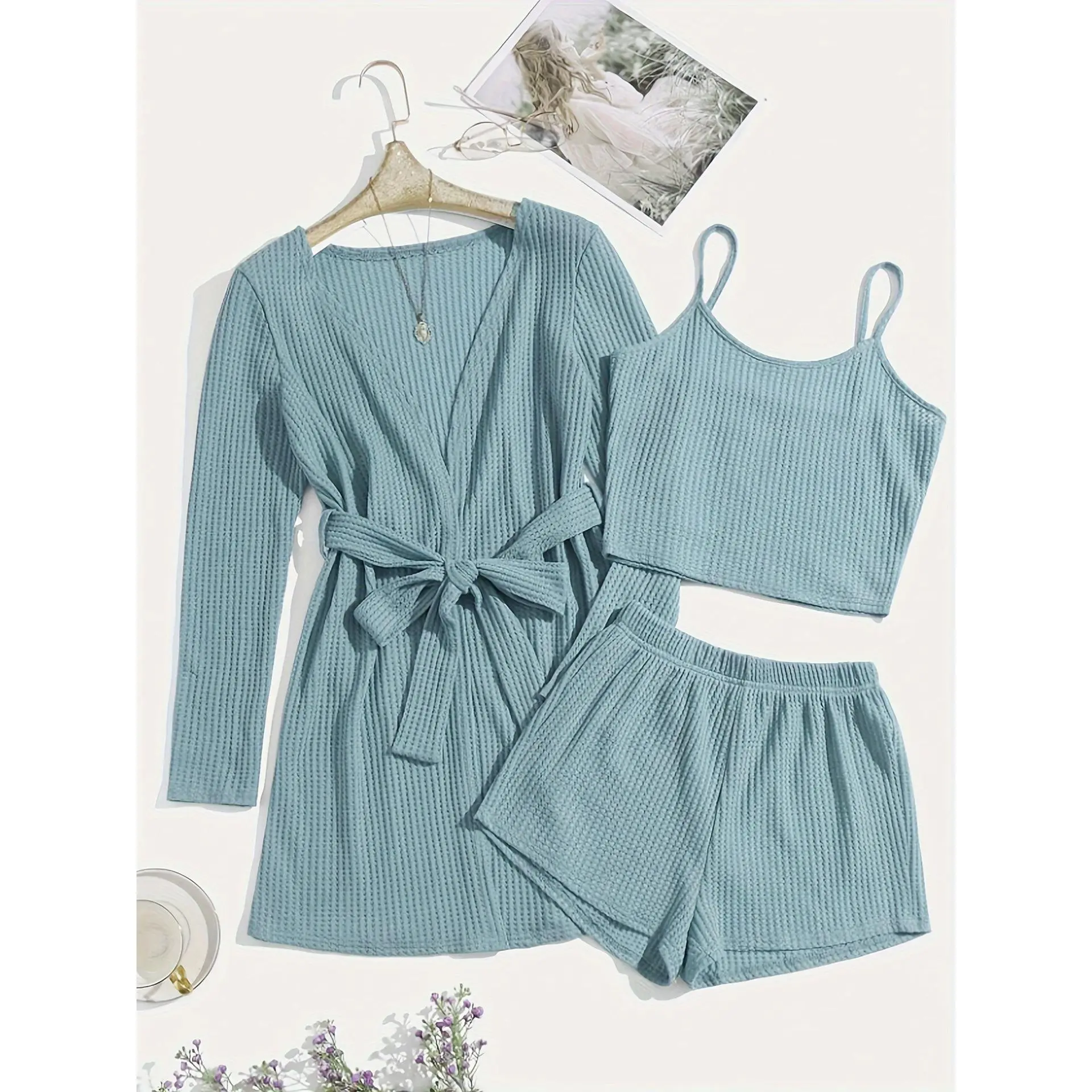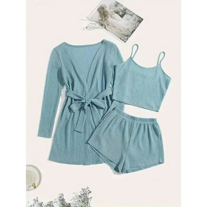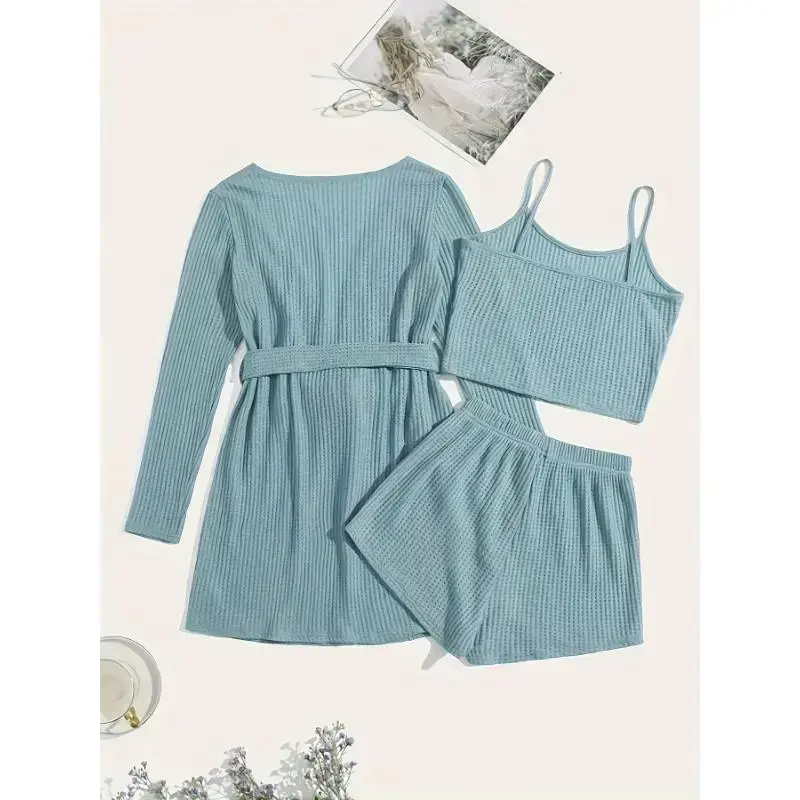 Women'S Casual Solid Waffle Pajama Set - Long Sleeve Robe with Tie Waist, Round Neck Tank Top, and Elastic Shorts, Polyester Blend, All-Season Comfort Wear, Relaxed Fit, Home Wear Robe | Relaxed Fit Robe | Polyester Blend Robe