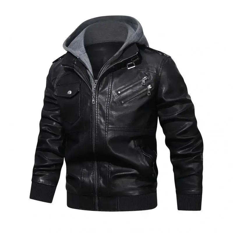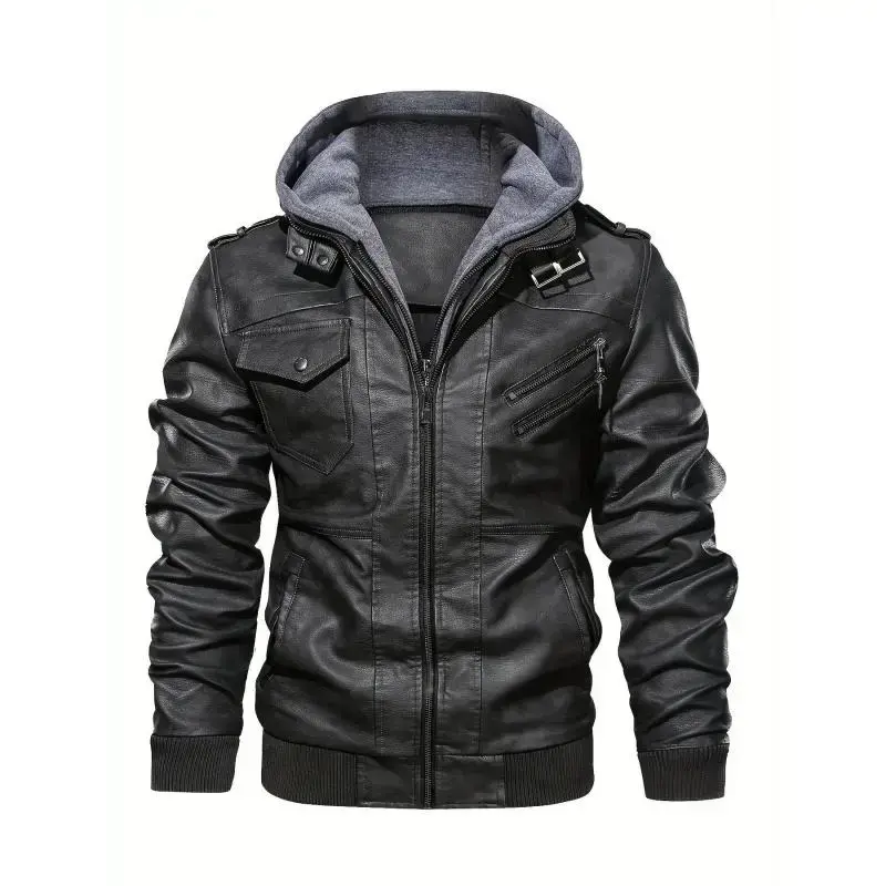 Premium Mens Hooded Leather Jacket - Fashionable Biker Style with Chic Multi Pockets, Durable Soft-shell for Casual Comfort