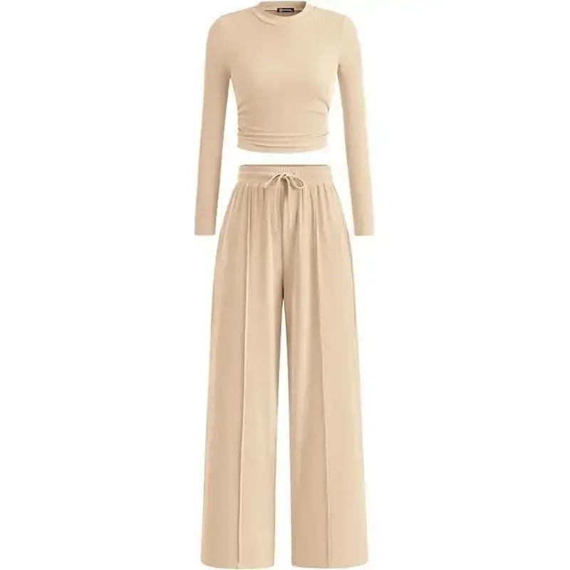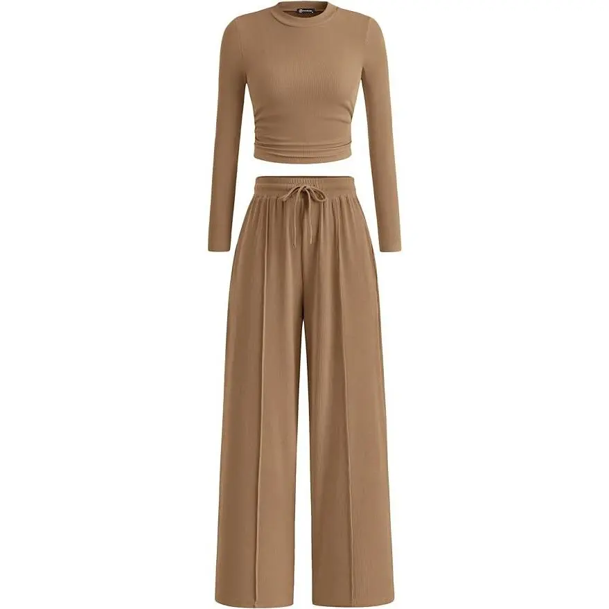 2-Piece Ribbed Knit Long Sleeve Crop Top Wide Leg Pants Matching Lounge Set Loungewear Casual Fabric