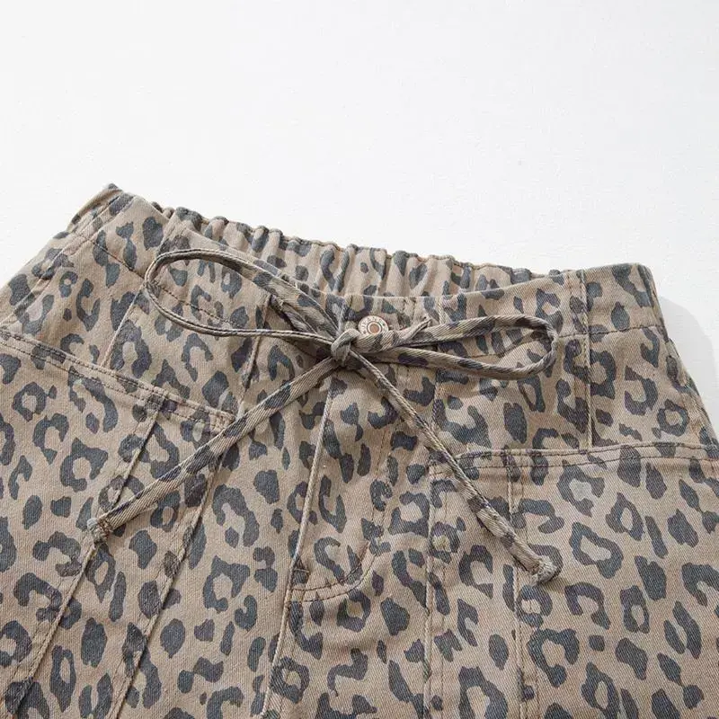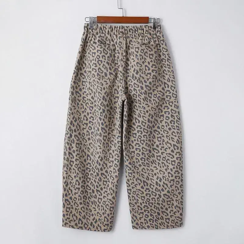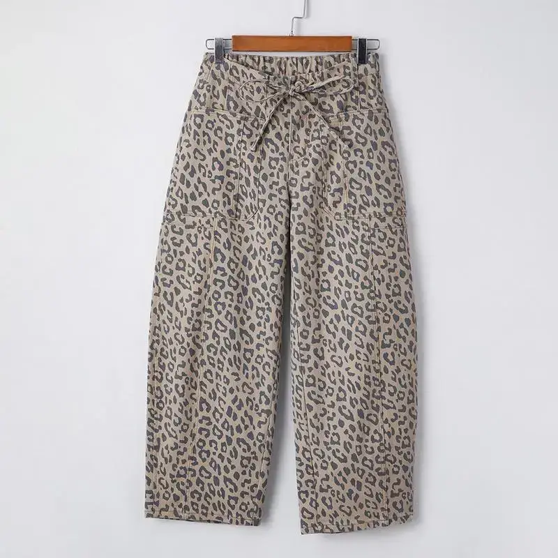 Khaki Leopard Print Wide Leg Pants, Drawstring Barrel Jeans with Pockets for Everyday Effortless Wear