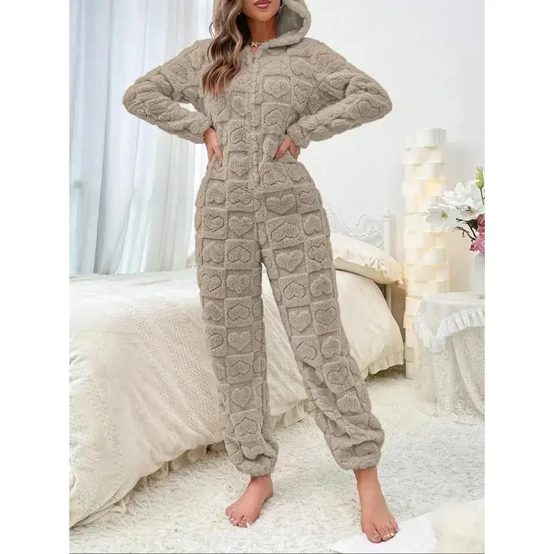 Women's Heart Jacquard Zip Up Hooded Sleep Jumpsuit, Casual Long Sleeve Jumpsuit for Fall & Winter, Women's Sleepwear for Indoor Wear��gift�� Womenswear Loungewear(gift)