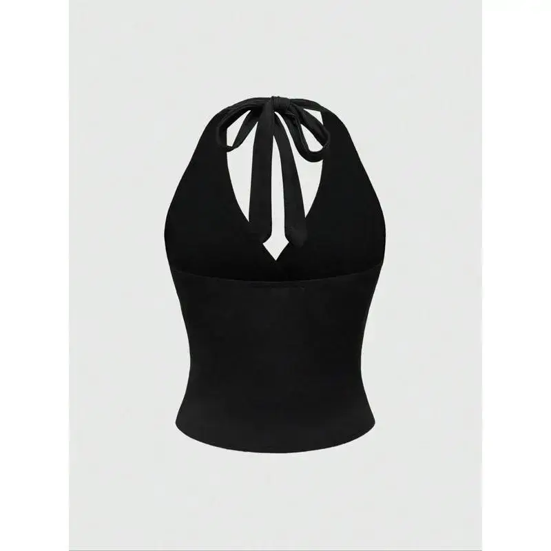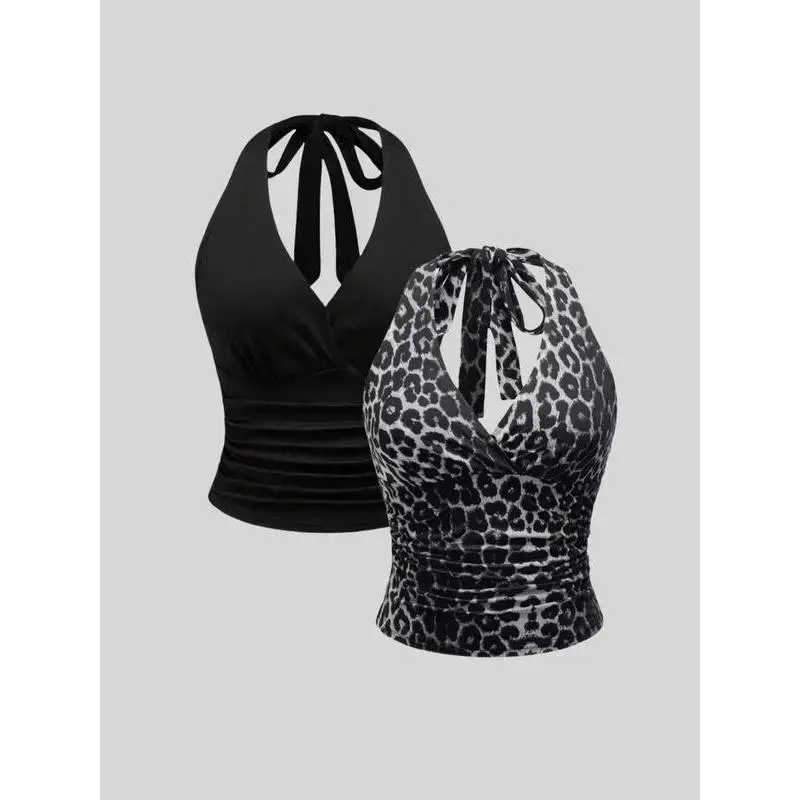 Women's Solid Color/leopard Print Halter Backless Top, Slim Casual Fitted Boho Chic Sleeveless Tie Top for Spring & Fall, Ladies Clothes for Daily Wear, Going Out Tops, Womenswear, Crop Tops, Casual Sleeveless Tank Top, Halter Tank Tops