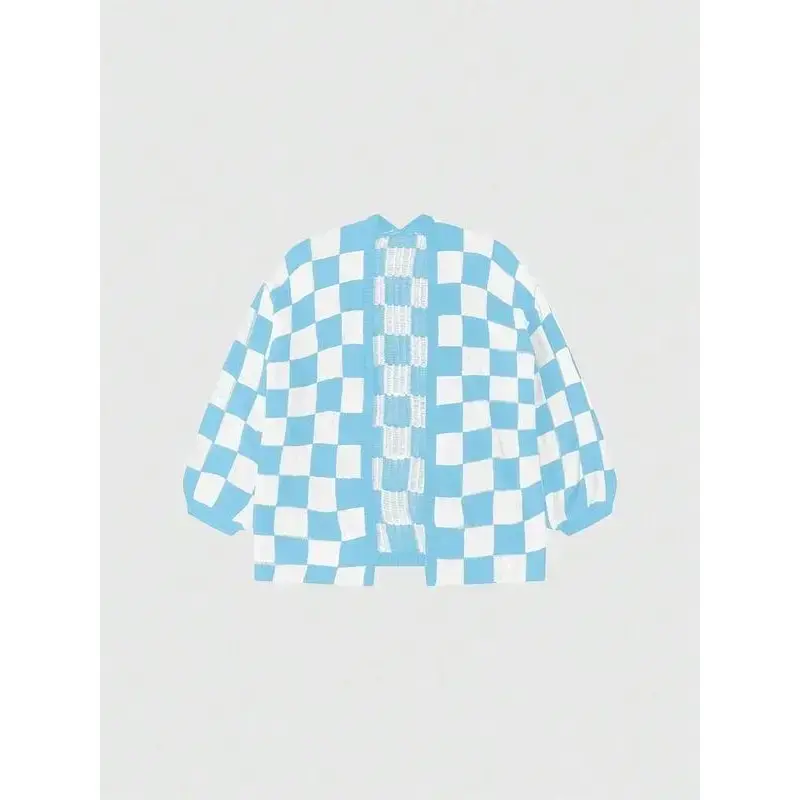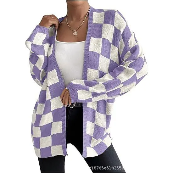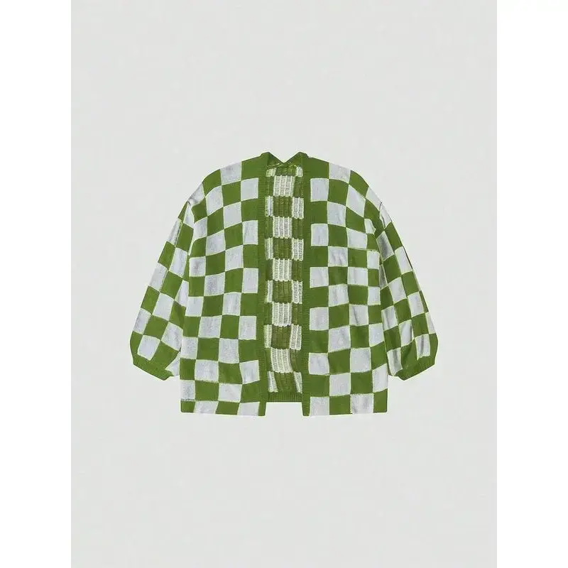 Women's Checkerboard Print Bishop Sleeve Open Front Cardigan, Fashion Casual Long Sleeve Knitwear for All Seasons, Women's Knit Clothing for Daily Wear, Cardigan for Women
