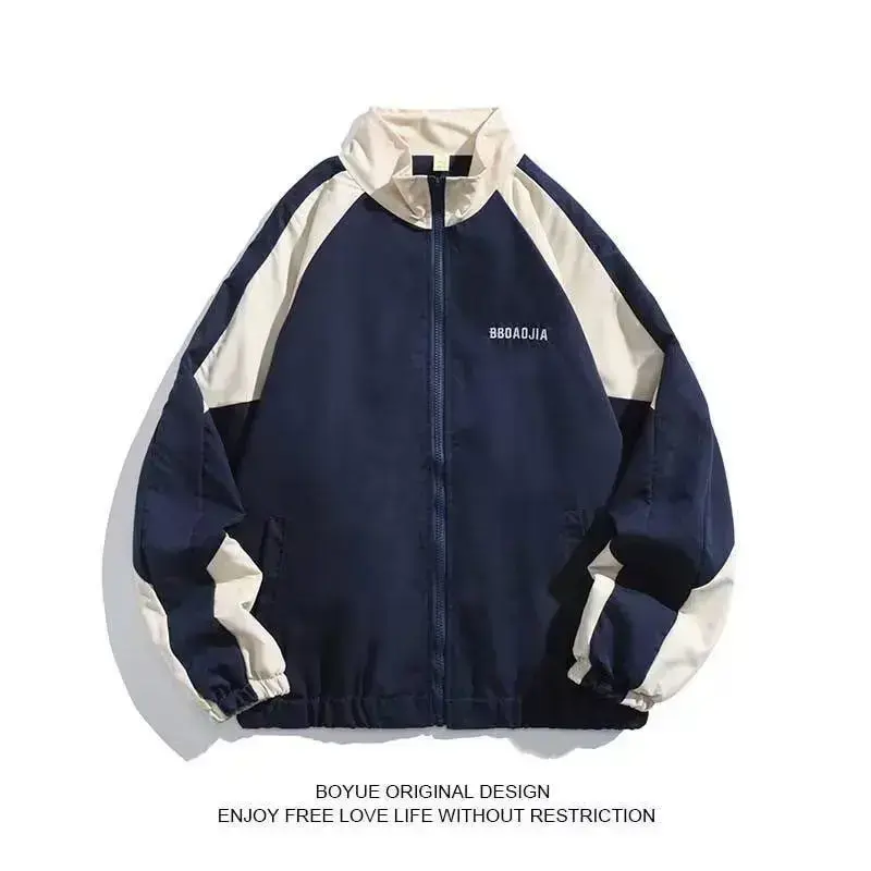 2025 Japanese Retro Color Block Stand Collar Jacket Men's Spring Autumn Trendy Loose College Style Couple Casual Coat