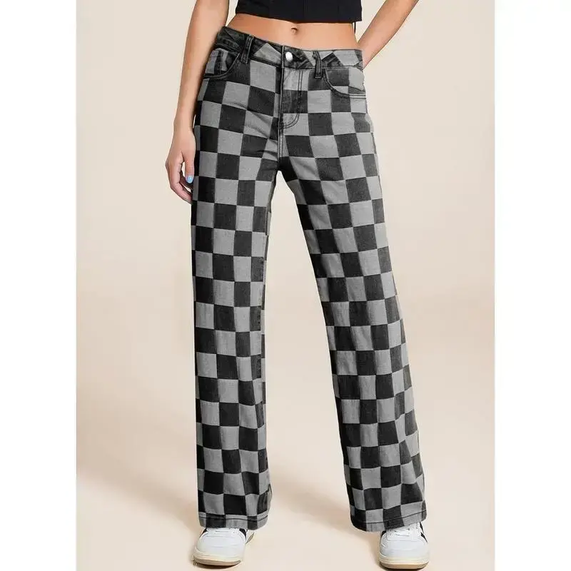 Soft Stretch Fabric High Waisted Jeans: Crafted from comfy and soft denim fabric, these women's jeans deliver a soft, breathable feel with just-right stretch for all-day comfort.The mid-weight denim maintains its shape while draping effortlessly.Please check our detailed sizing chart before ordering to ensure your perfect fit Modern Checkered Pattern Defines Wide Leg Jeans: Featuring an on-trend checkered pattern and wide leg design, these pants combine bold visual appeal with straight-leg tailoring.The non-restrictive silhouette flatters all body types High Waisted Jeans Enhance Effortless Style: The high rise waist gently contours your natural curves while providing smoothing support.Strategic stitching eliminates waist gap issues and creates subtle curve definition without restrictive compression Straight Leg Denim Pairs with Any Outfit:Designed for versatile styling, these pants complement slim sweaters, oversized leather jackets, or casual tees.Wear with boots for urban edge or sandals for weekend vibes Checkered Wide Leg Pants for Every Occasion:Dress up with heels for dinner dates or keep relaxed with sneakers at farmers' markets. The durable yet soft fabric transitions seamlessly from brunch dates to casual Fridays at work