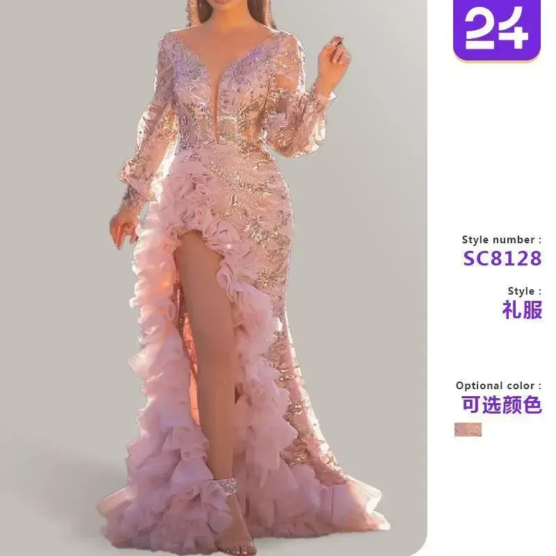 2025 autumn new women's sexy mesh trailing sequined slit pink evening dress Formal Womenswear wedding guest dresses indian love prom dress gold dress Workwear Long Sleeve Basic Minimalist