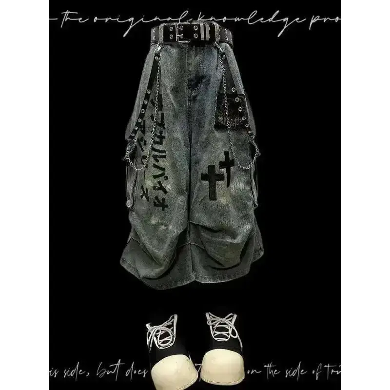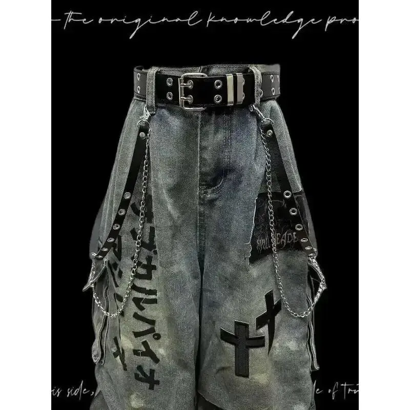 Gothic Punk Wasteland Jeans - Seven-Part Patchwork Wide Leg, Distressed Wrinkled Pants Menswear Trouser Man Streetwear Denim Pocket Tropical