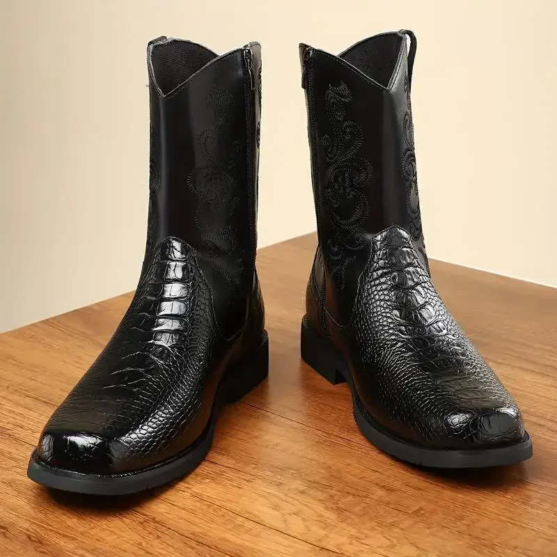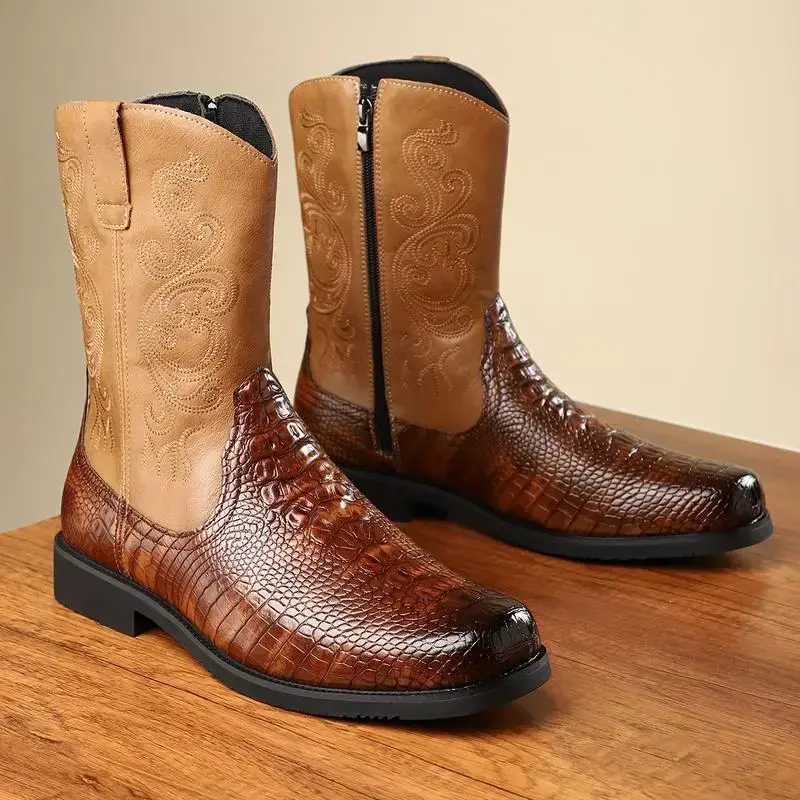 【PlusSize】Eleet Cowboy Boots for Men - Men's Western Boots With Embroidered, Slip Resistant Square Toe Chunky Heel Ankle Boots, Durable and Fashionable Retro Classic Short Botas Walking Shoes, Comfort Closed Footwear