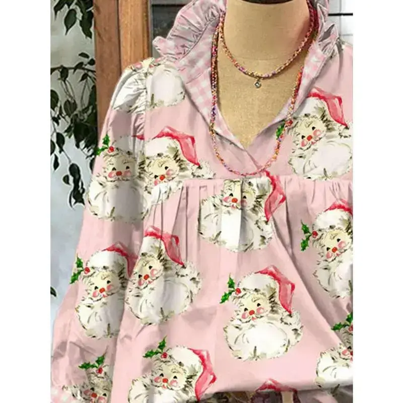 Women's Casual Christmas Holiday Santa Claus Print Ruffle Neck Long Sleeve Shirt Top