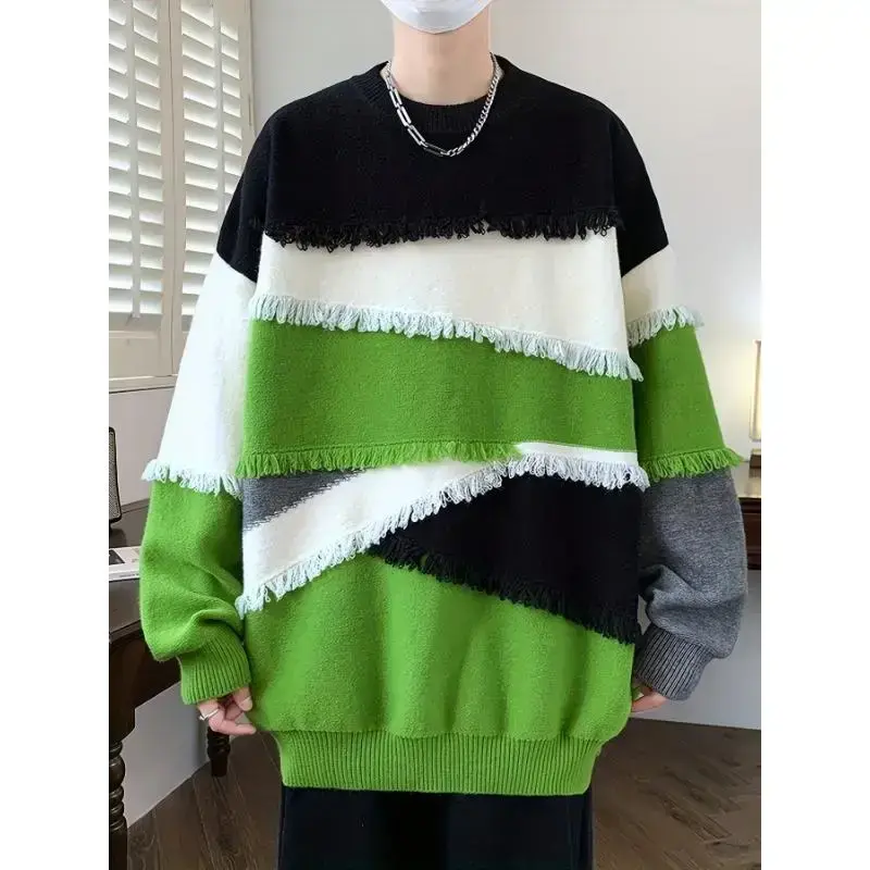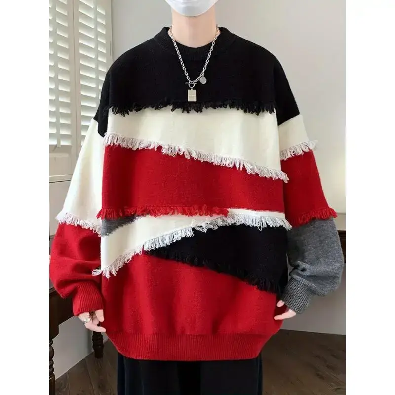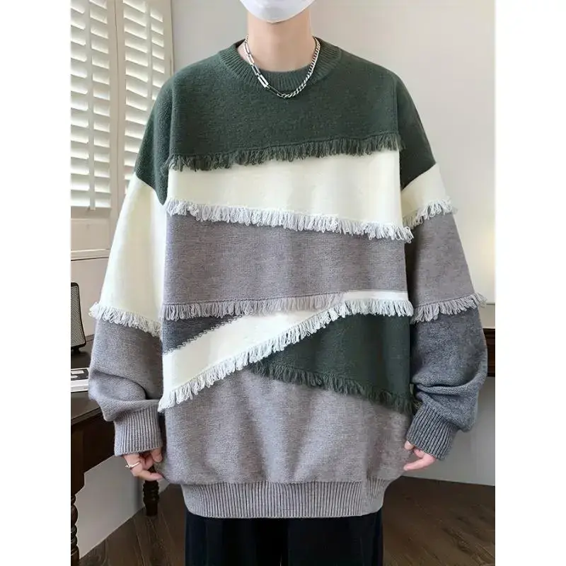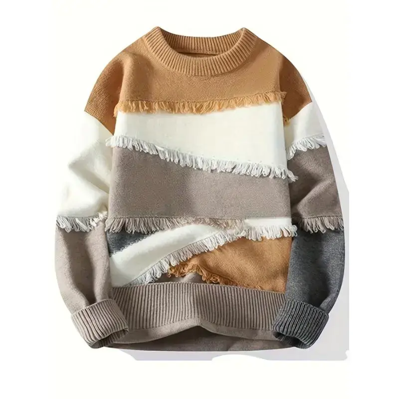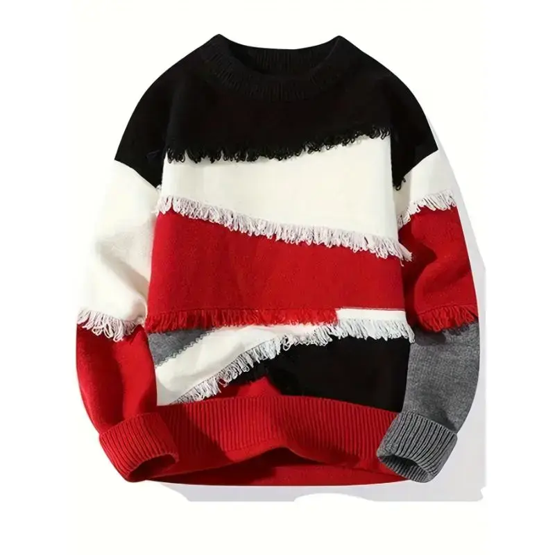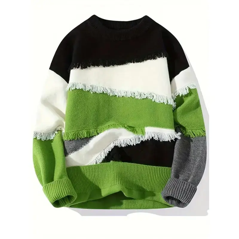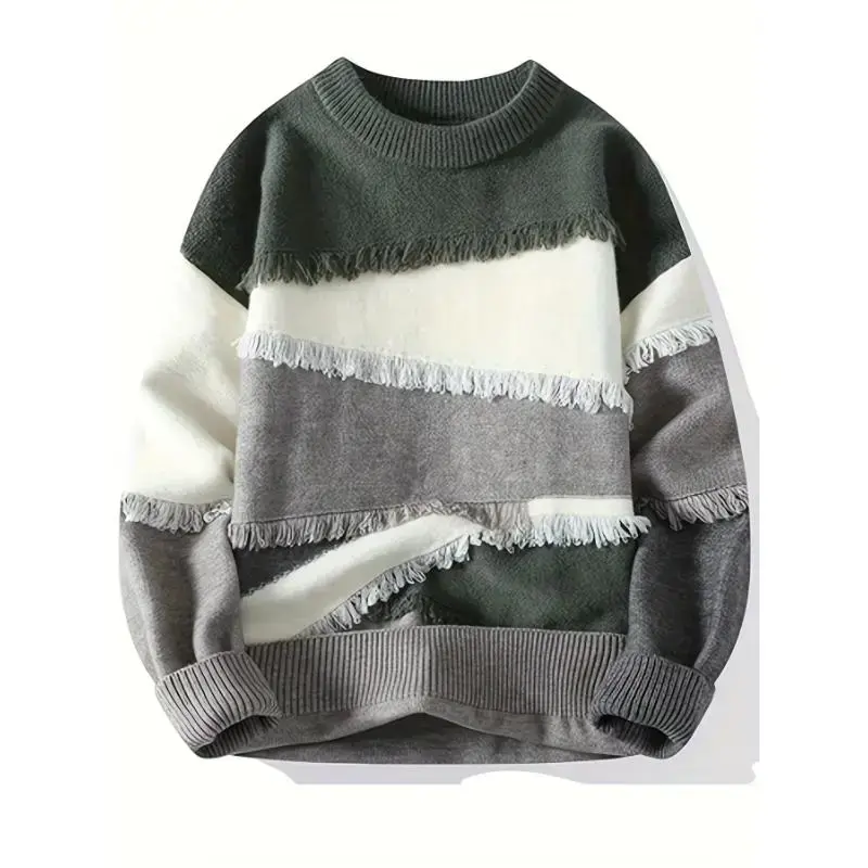 Men's Color Block Frayed Knitted Pullover, Casual Long Sleeve Crew Neck High Stretch Sweater For Fall Winter