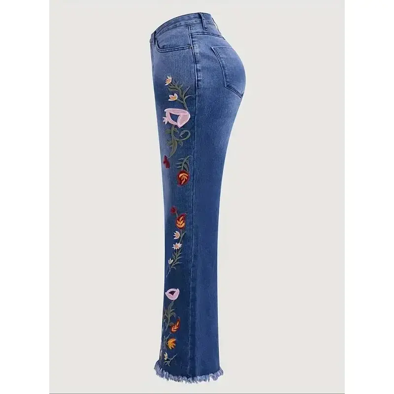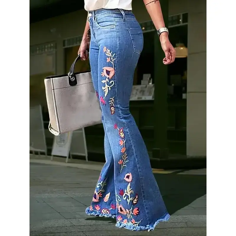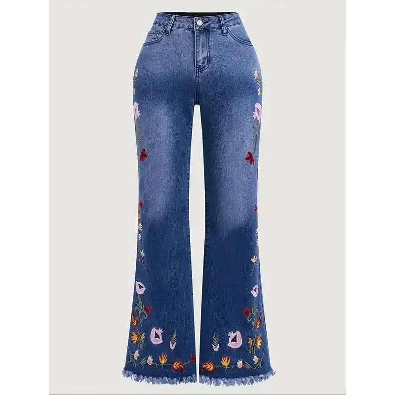 【Plus Size】Floral Embroidery Flare Leg Stretchy Jeans, Fashion Casual Bell Bottom Trousers for Daily Outdoor Wear, Women Plus Clothing for All Seasons(gift) Elegant Fit