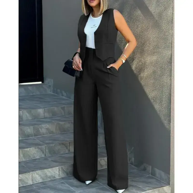 2024 New Fashion Suit Vest Jacket Wide Leg Pants Casual Suit Womenswear Comfort Minimalist Sleeveless Adjustable Blazers