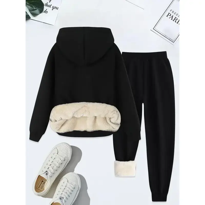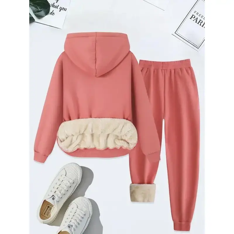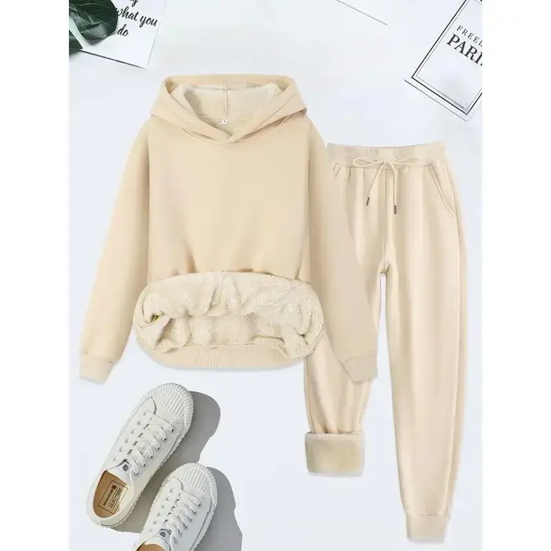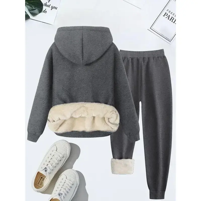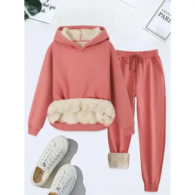 Women's Thermal Lined Solid Color Hoodie & Drawstring Waist Pants Two-piece Set, Casual Long Sleeve Hooded Sweatshirt & Pocket Trousers for Fall & Winter, Women's Clothes for Daily Wear