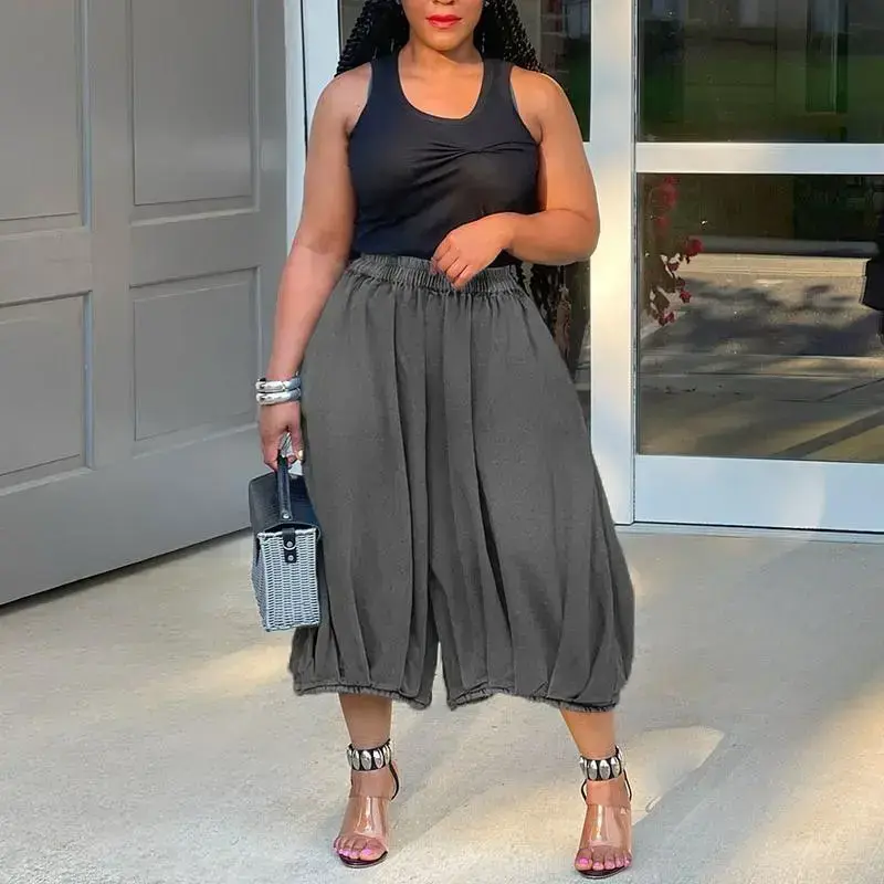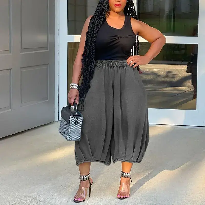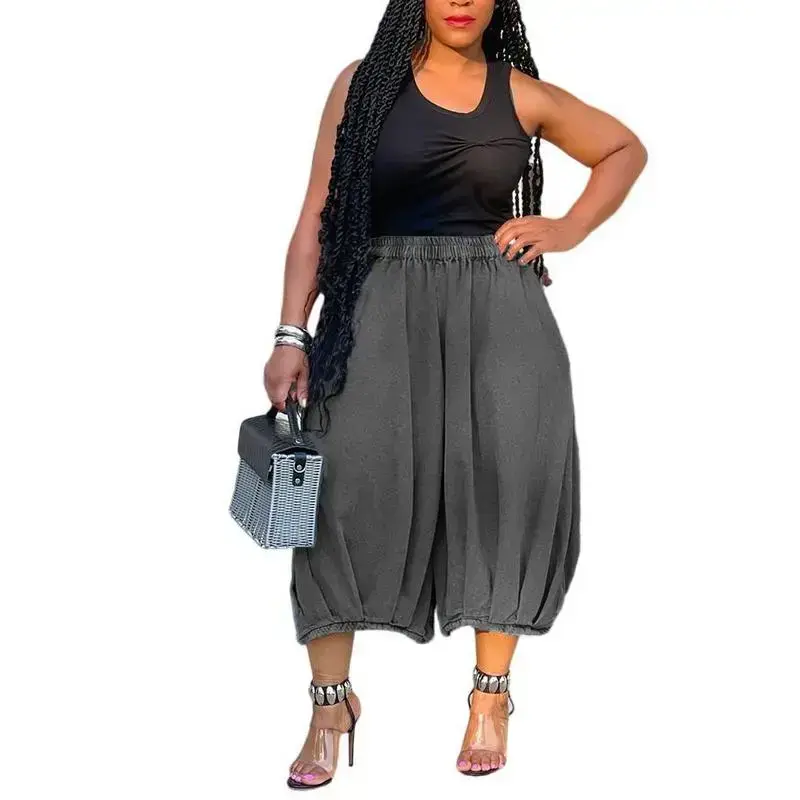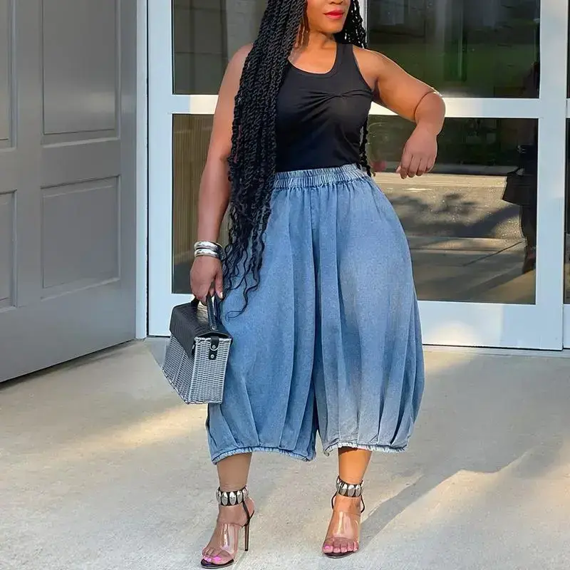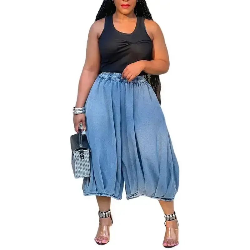 Street Fashion Casual Jeans Elastic Waist Straight Wide Leg Cropped Pants.