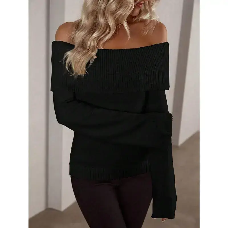 Off Shoulder Foldover Ribbed Knit Sweater,Long Sleeve Tops Fit Knitwear
