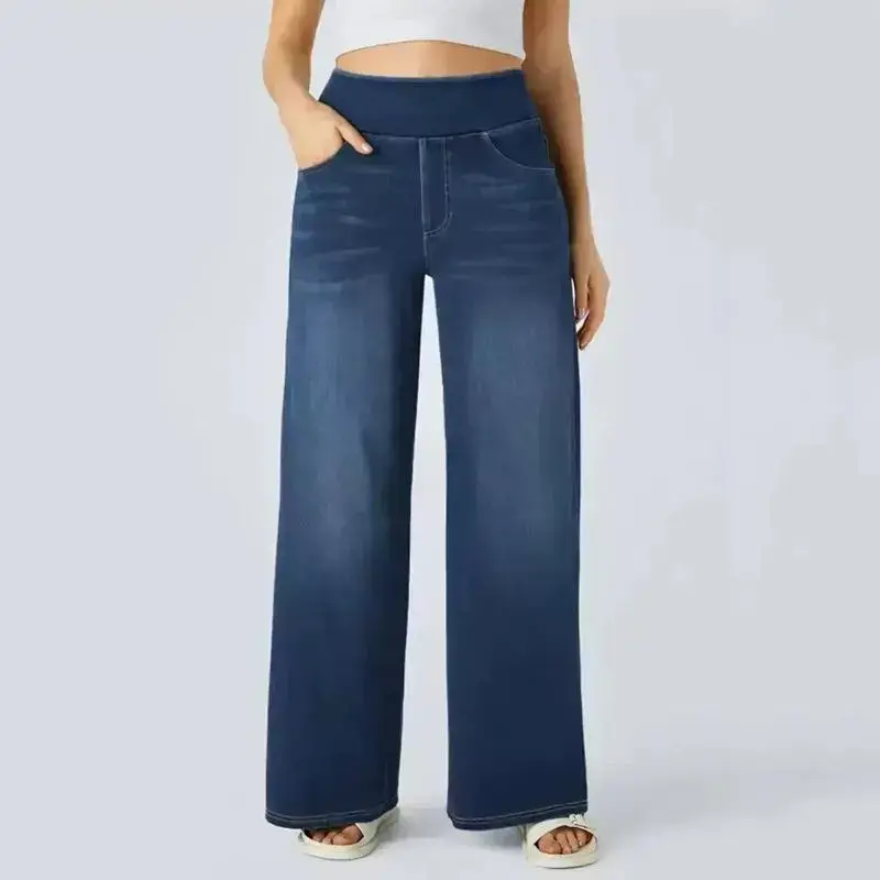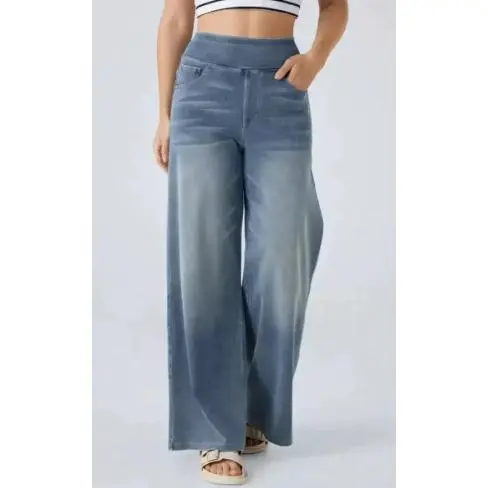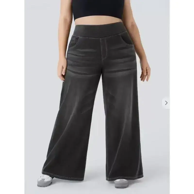 High Waisted Multiple Pockets Baggy Wide Leg Washed Stretchy Knit Casual Jeans Pants Denim#Summertime#Summer Women