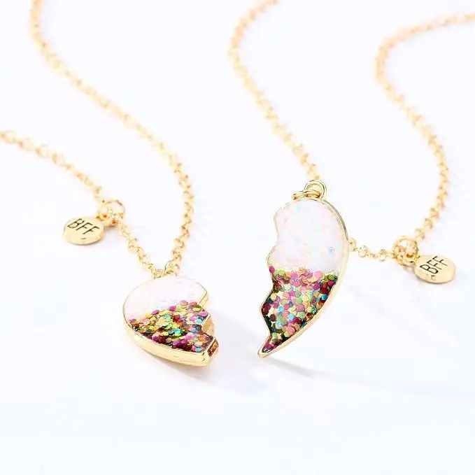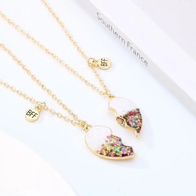 Features interlocking heart charms or puzzle pieces with "Best Friends" engraving—represents friendship connection and lasting memories.