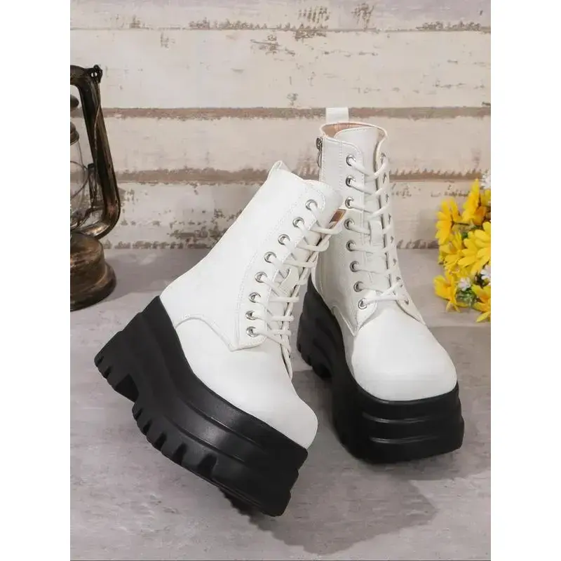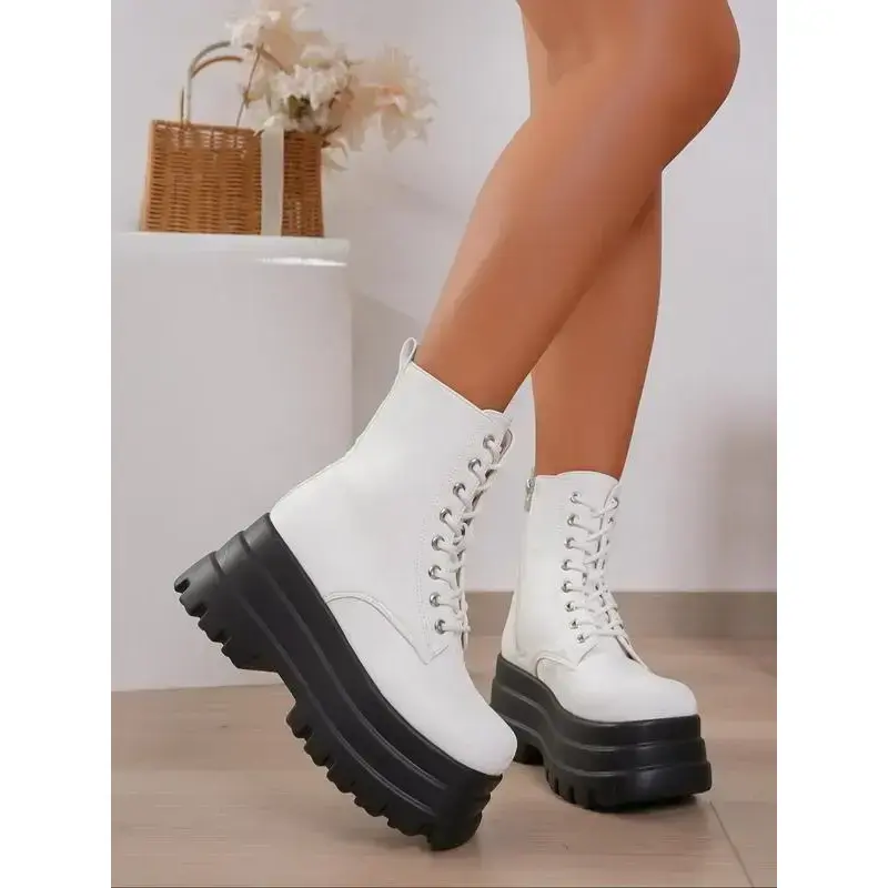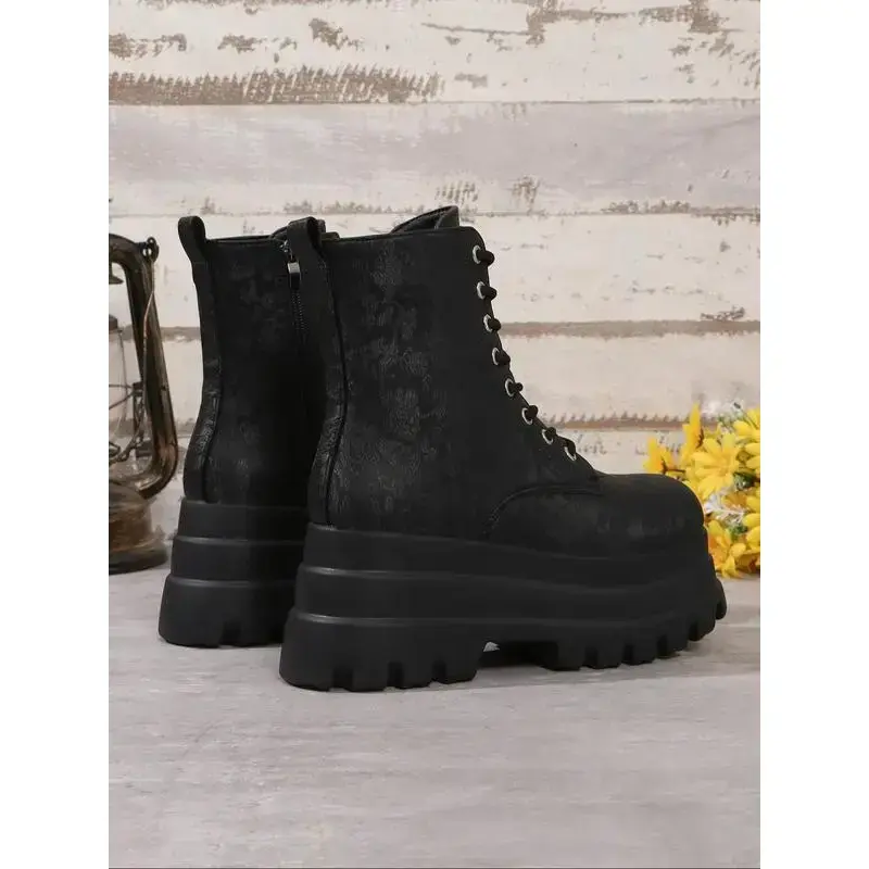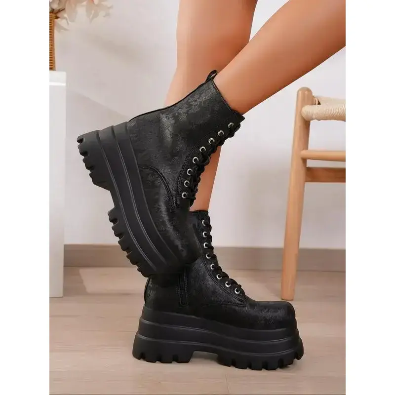 Valentine's Day Women's Square Toe Solid Color Lace Up Ankle Platform Boots, Casual Comfortable Platform Boots for Daily Wear, Female All-match Trend Shoes for Winter