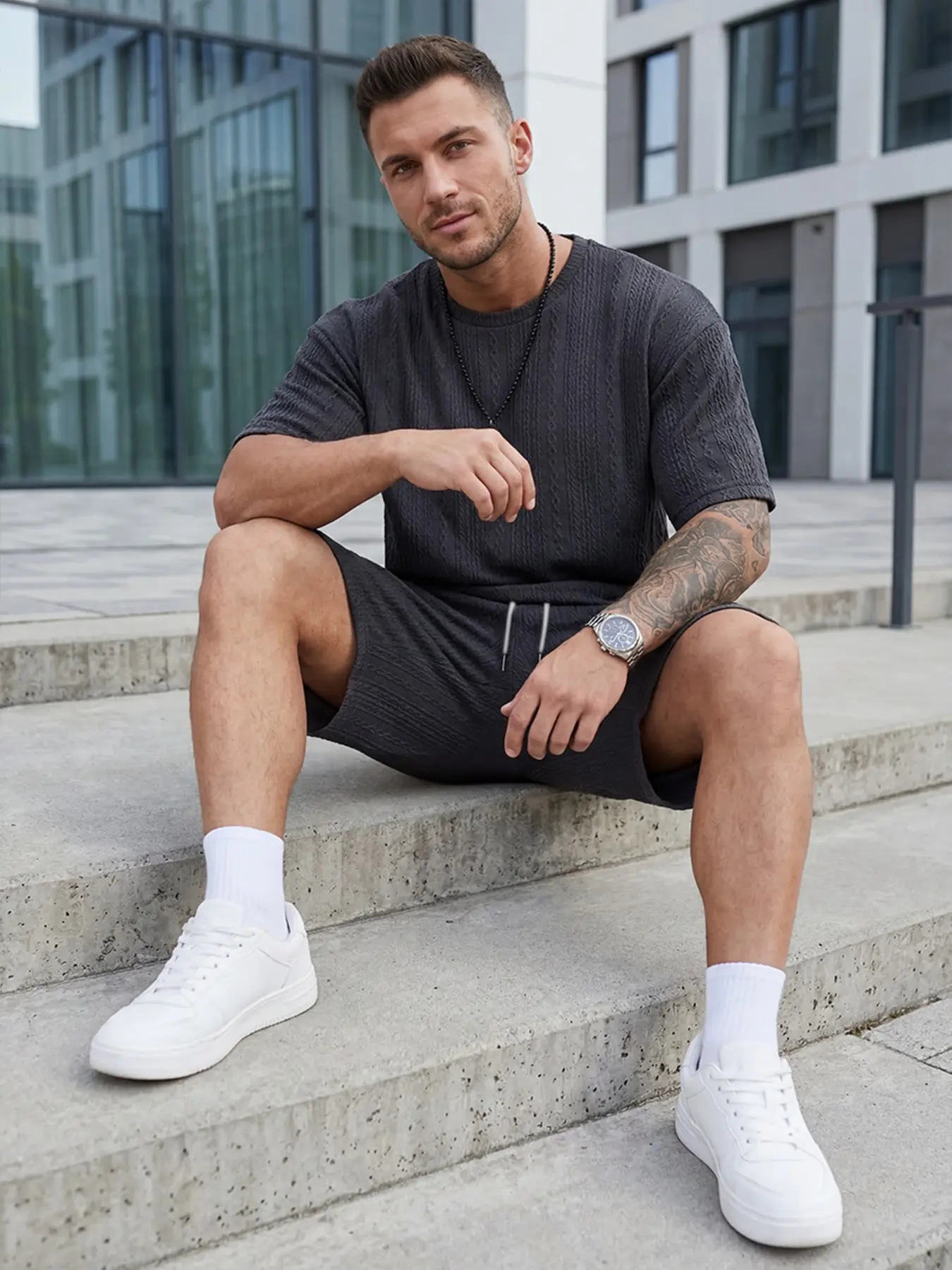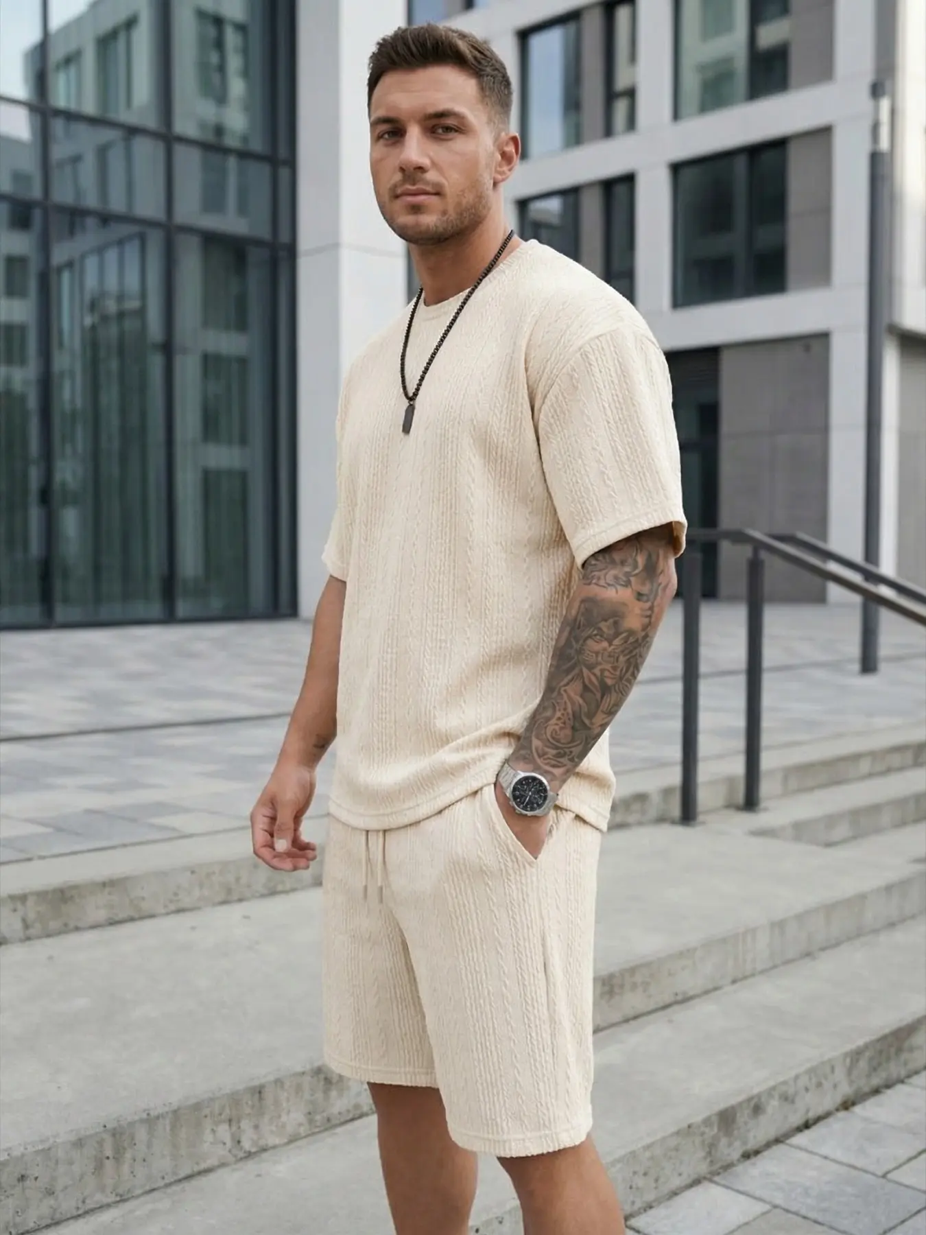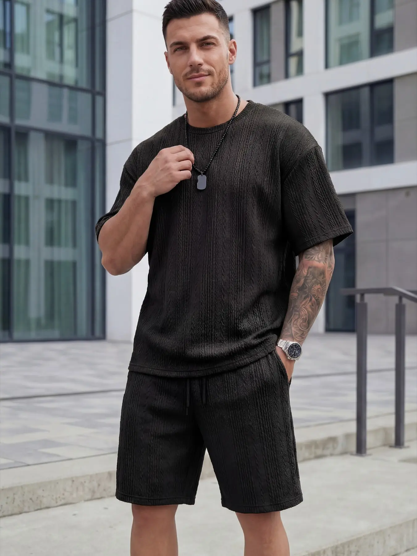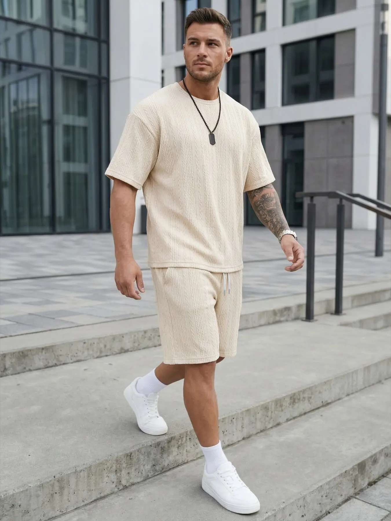 Men's Youth Textured Casual Vacation Outdoor Round Neck Loose Fit T-Shirt + Drawstring Shorts, Short Sleeve, Fitted, Plain, Contrast Binding