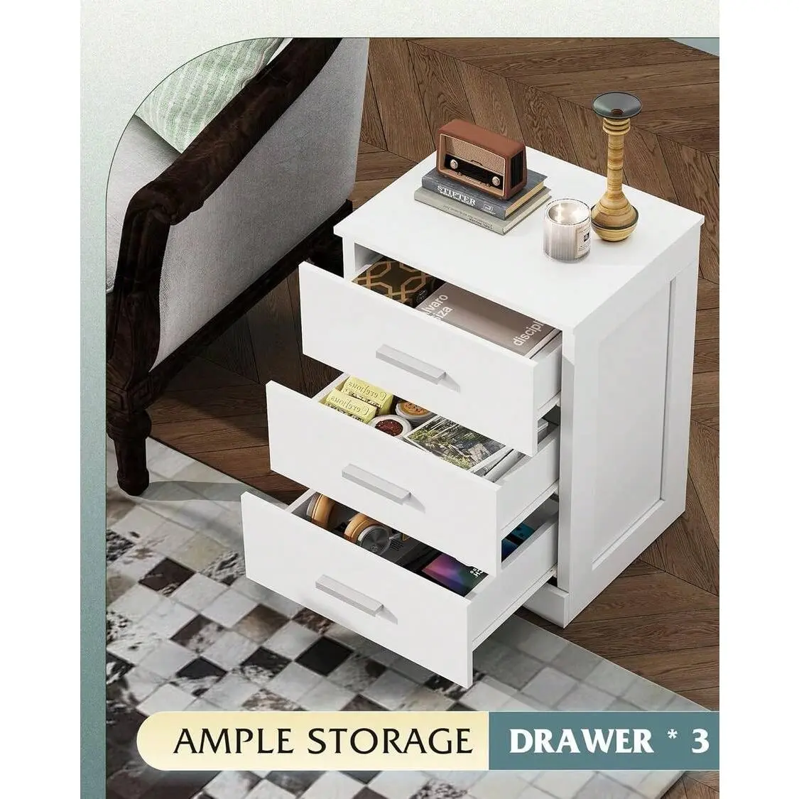 This bedside table features 3 spacious storage drawers, providing ample space to organize your daily essentials-from bedtime books, phone chargers, and jewelry to small gadgets, cosmetics, and other personal items.The drawers glide smoothly, allowing easy access to your belongings while keeping your space tidy and clutter-free, ideal for busy daily life and small spaces like dorms or compact bedrooms.