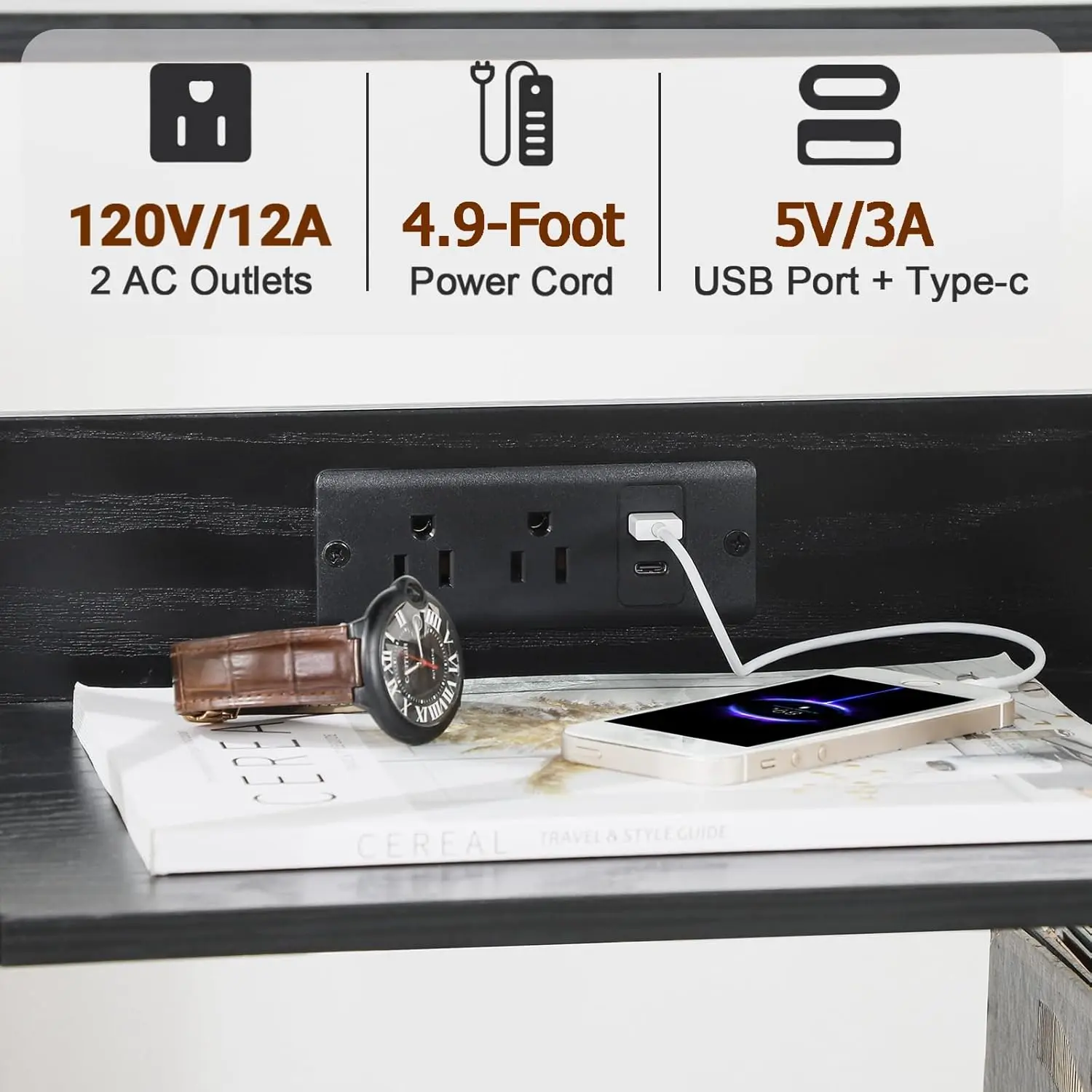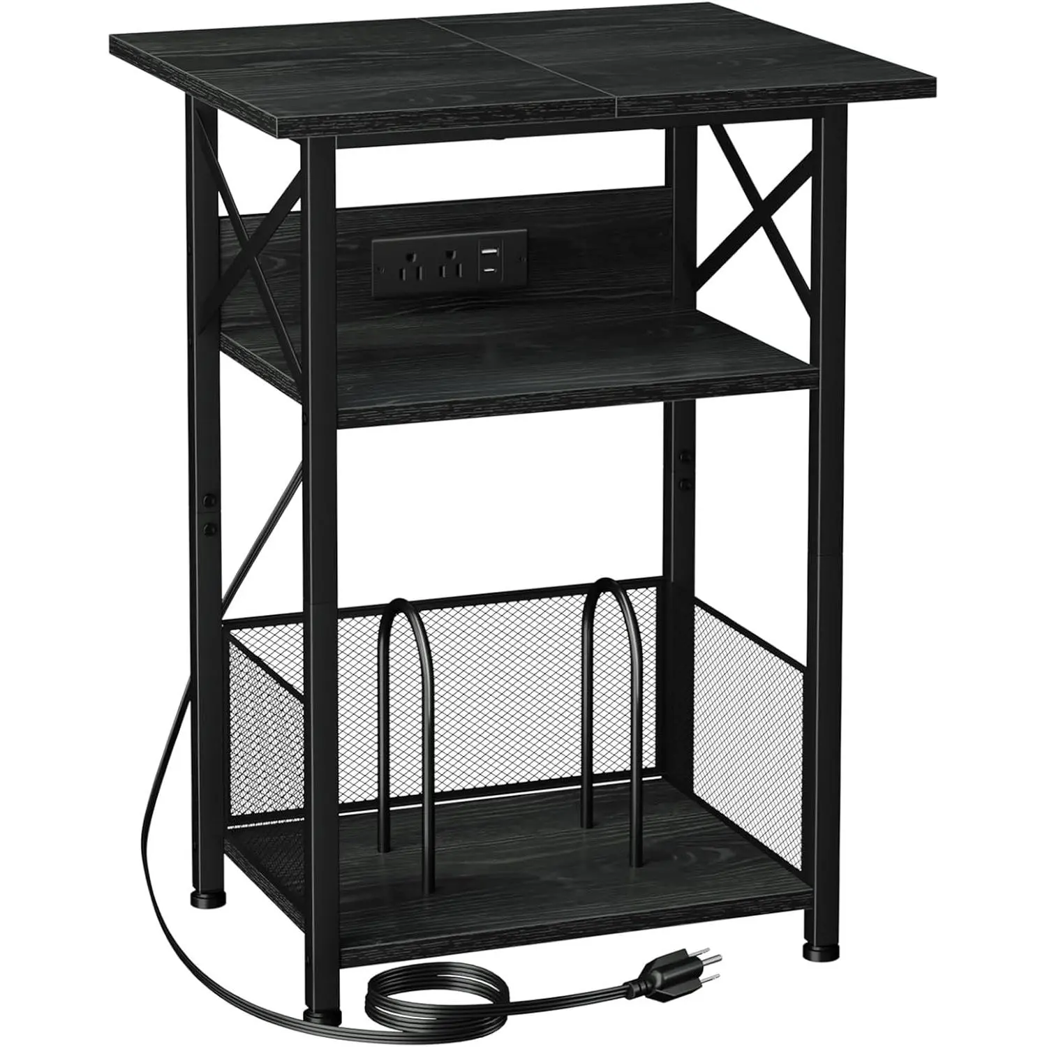 Record player stand with charging station, turntable stand with storage cabinet, three-tier side table can hold up to 100 records, vinyl record stand, suitable for living room, black