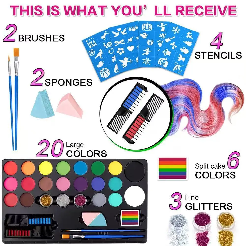 【Complete Set】: Includes brushes, sponges, stencils, and various paints for creative face painting.