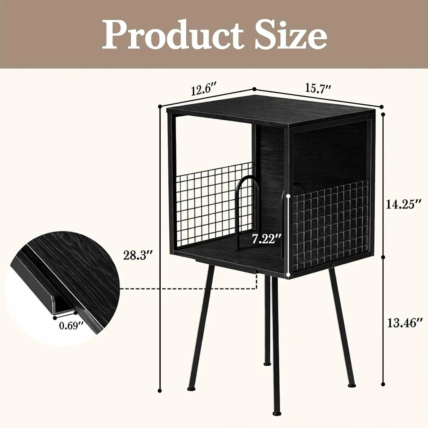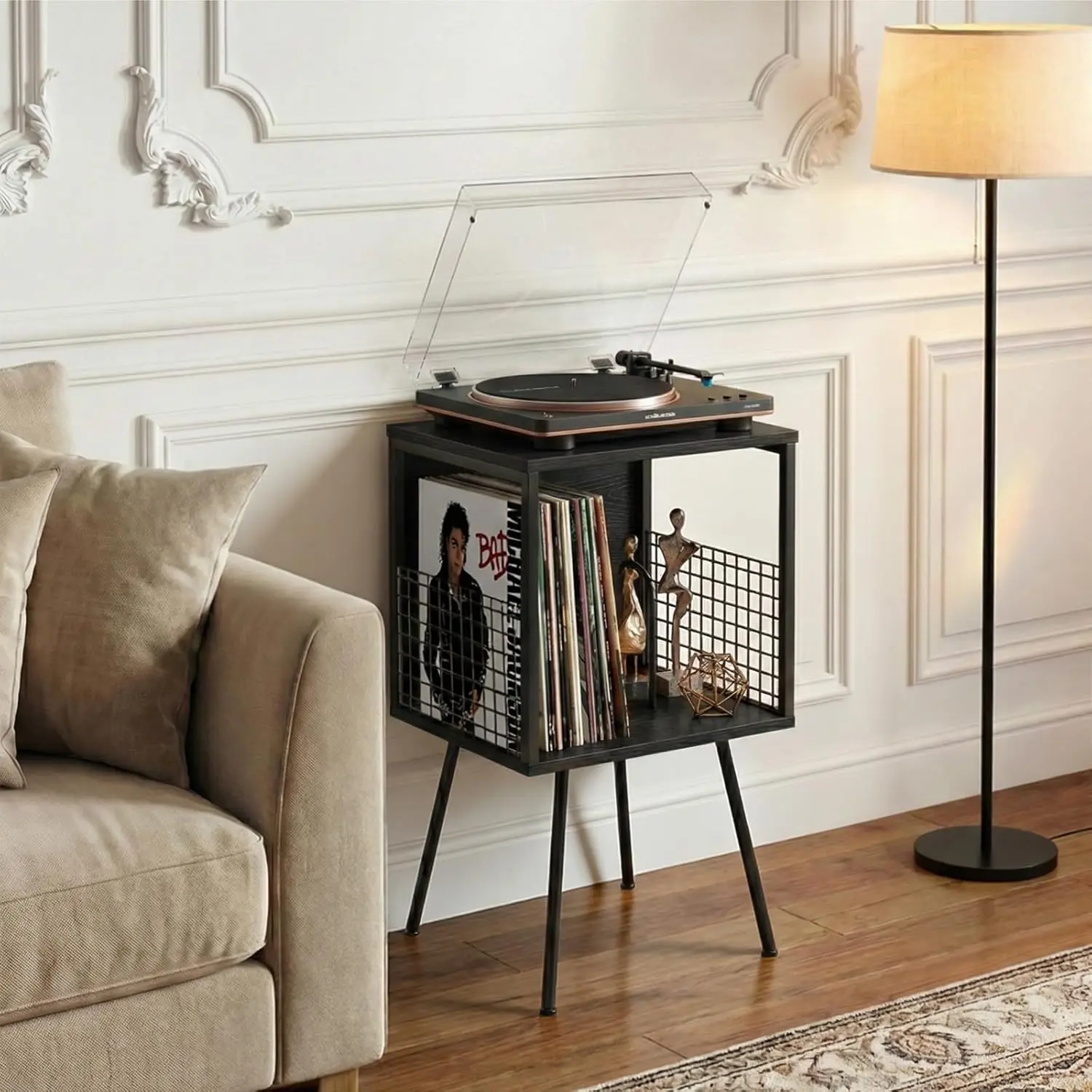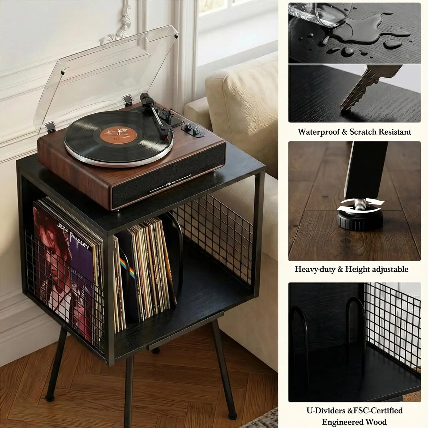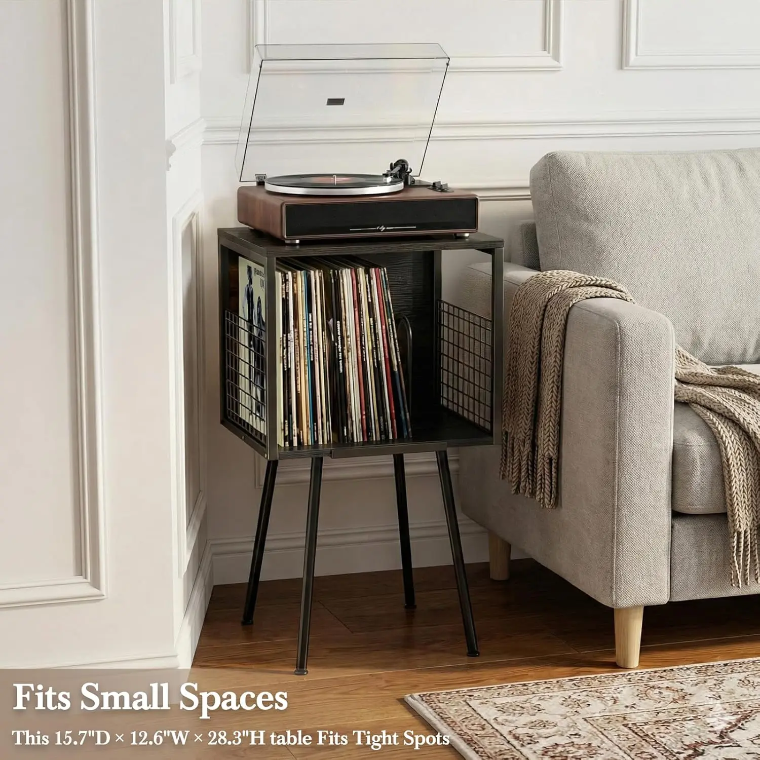 Record player stand with storage function, can hold over 100 vinyl records, industrial-style turntable stand with storage rack, suitable for LP record storage in small spaces, black side table