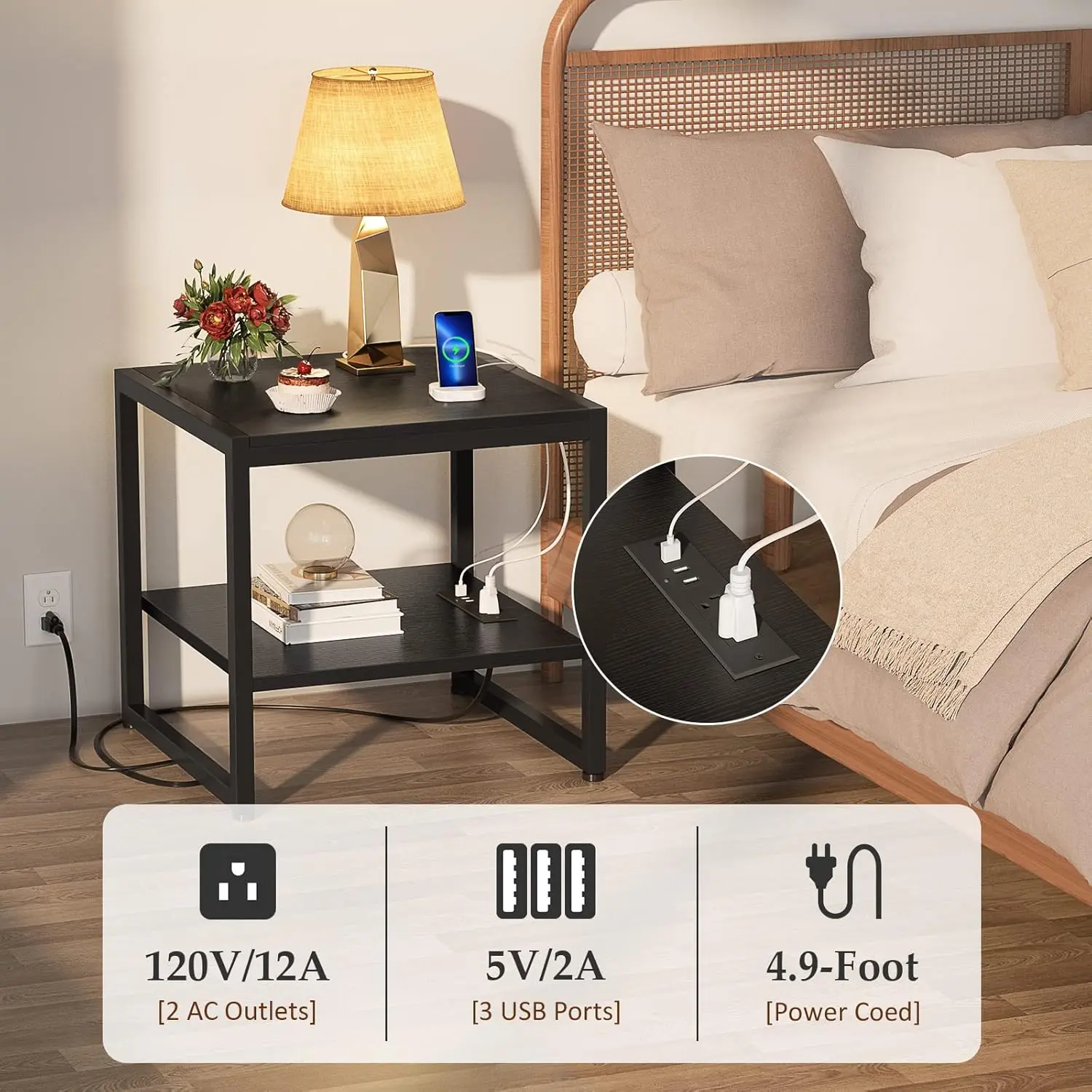Side table with charging station, 20inch mini refrigerator stand with power outlet, heavy-duty living room side table, small table stand and refrigerator table, black