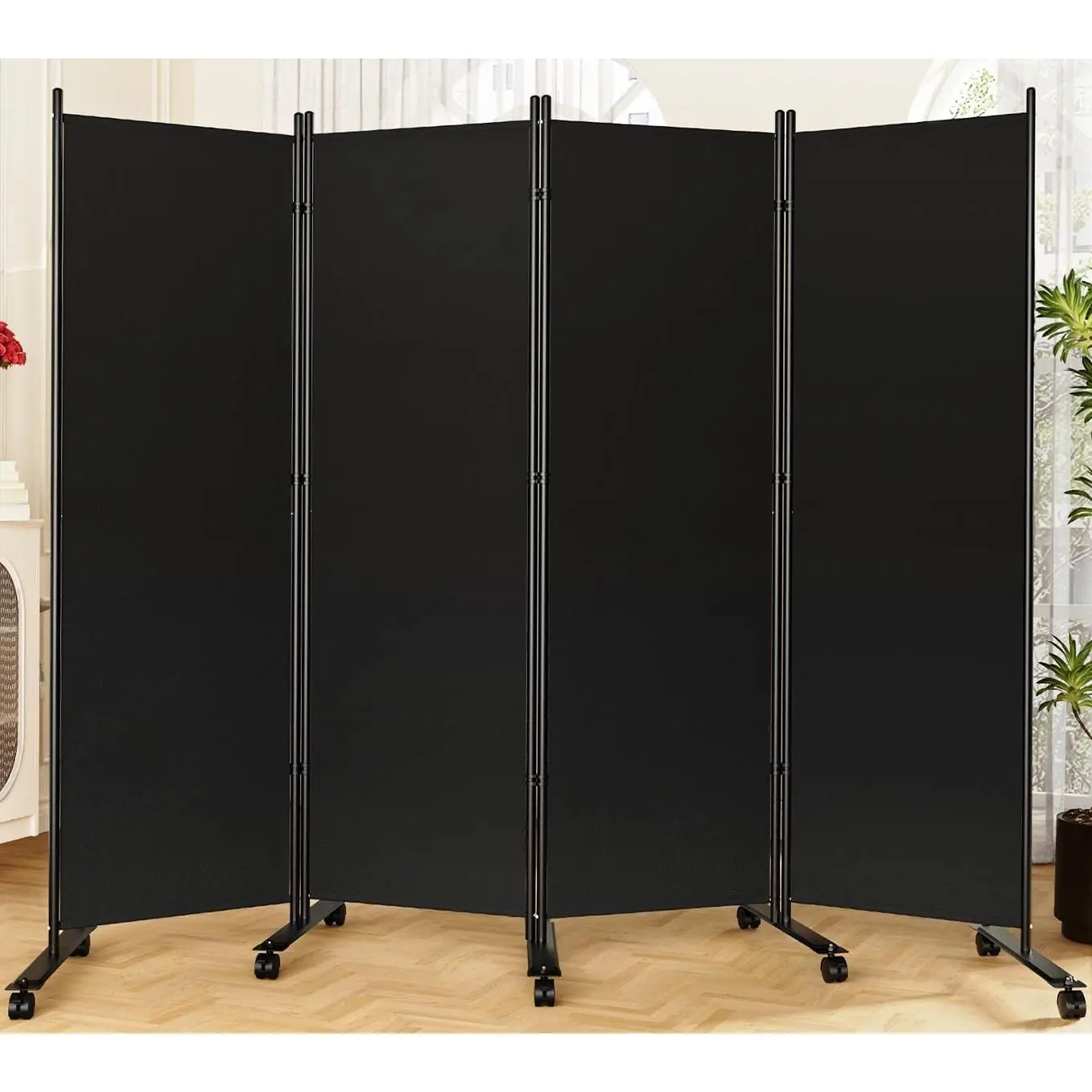 Room Divider 6FT Folding Privacy Screens with Lockable Wheels, 4 Panel Room Partition for Room Separator, 88" W Freestanding Portable Fabric Wall Dividers for Home Dorm Studio Office, Black