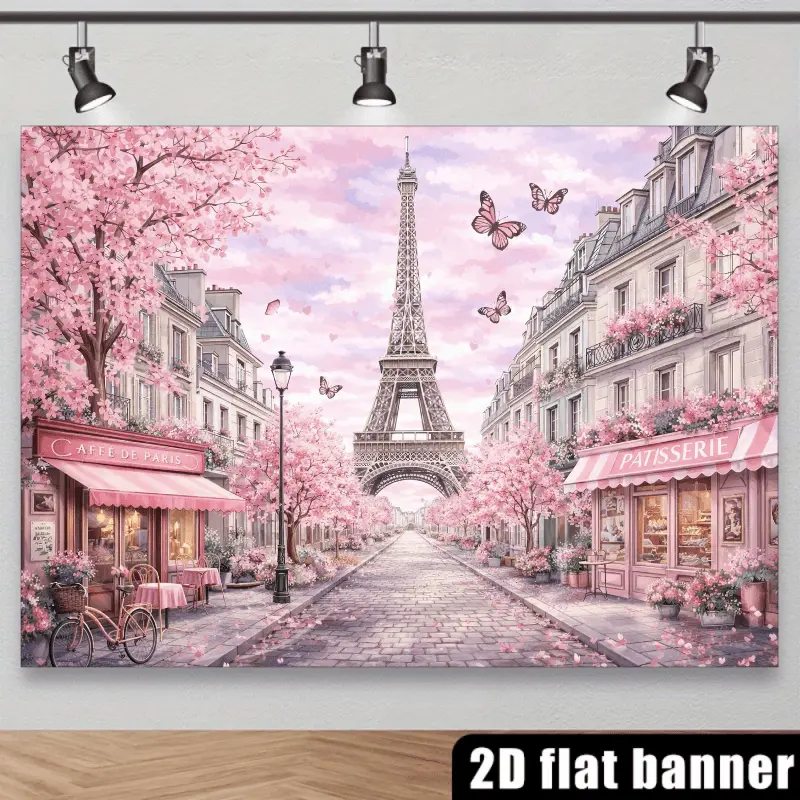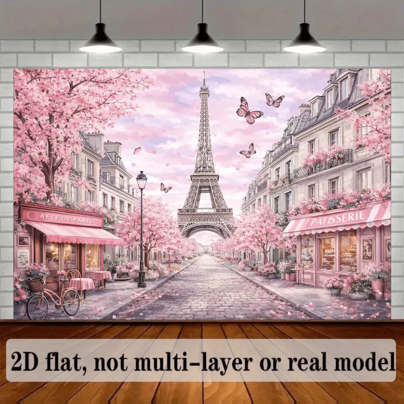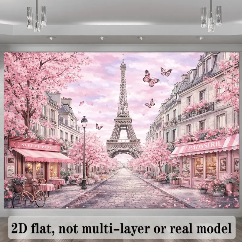 French Paris Cherry Blossom Backdrop Suitable for Wedding Decorations, Photo Studio Background with Eiffel Tower, Fountain & Pink Blossoms - Wrinkle-Resistant Spring Theme for Parties, Birthdays, Home Decor - No