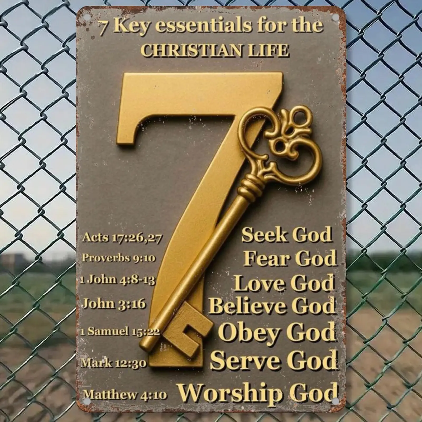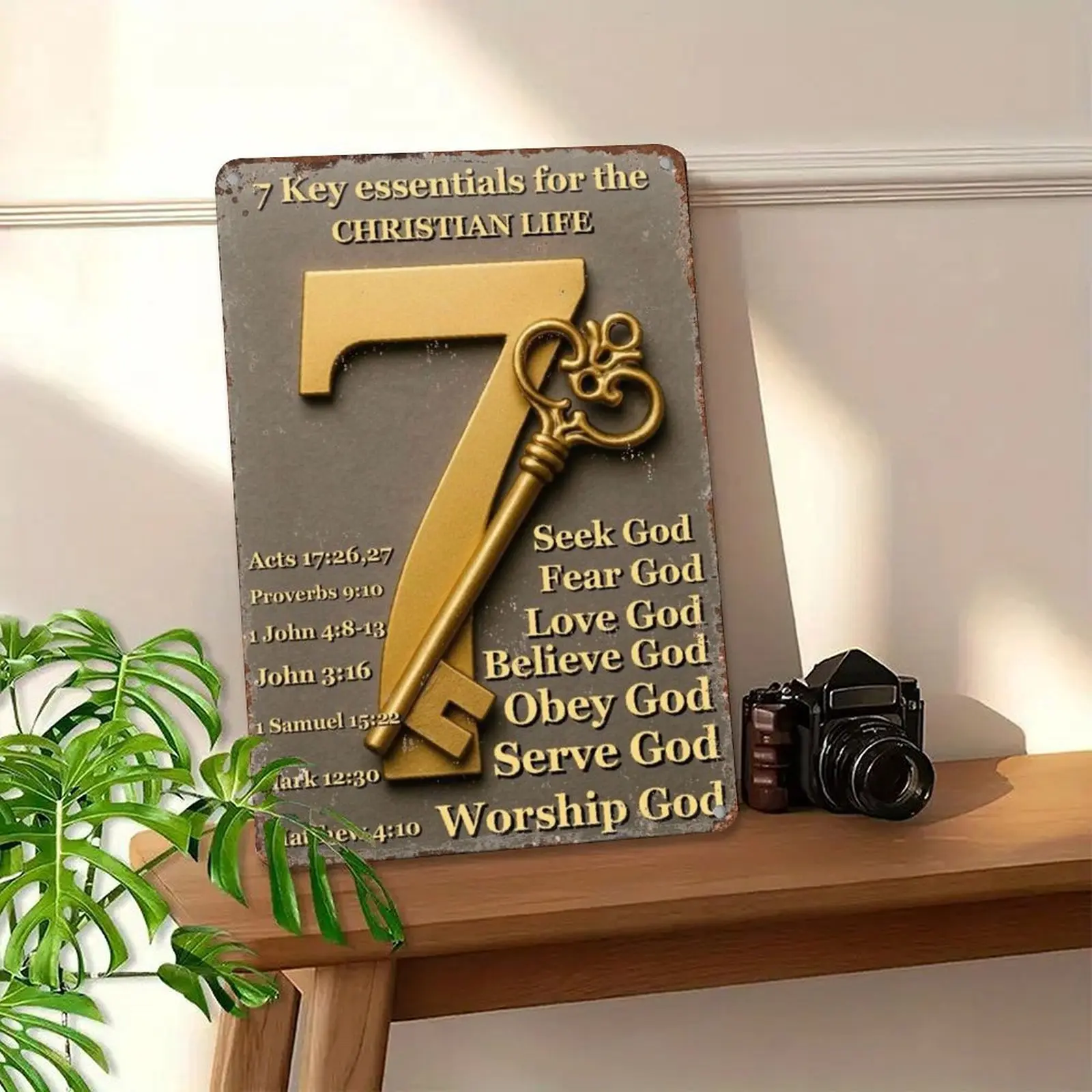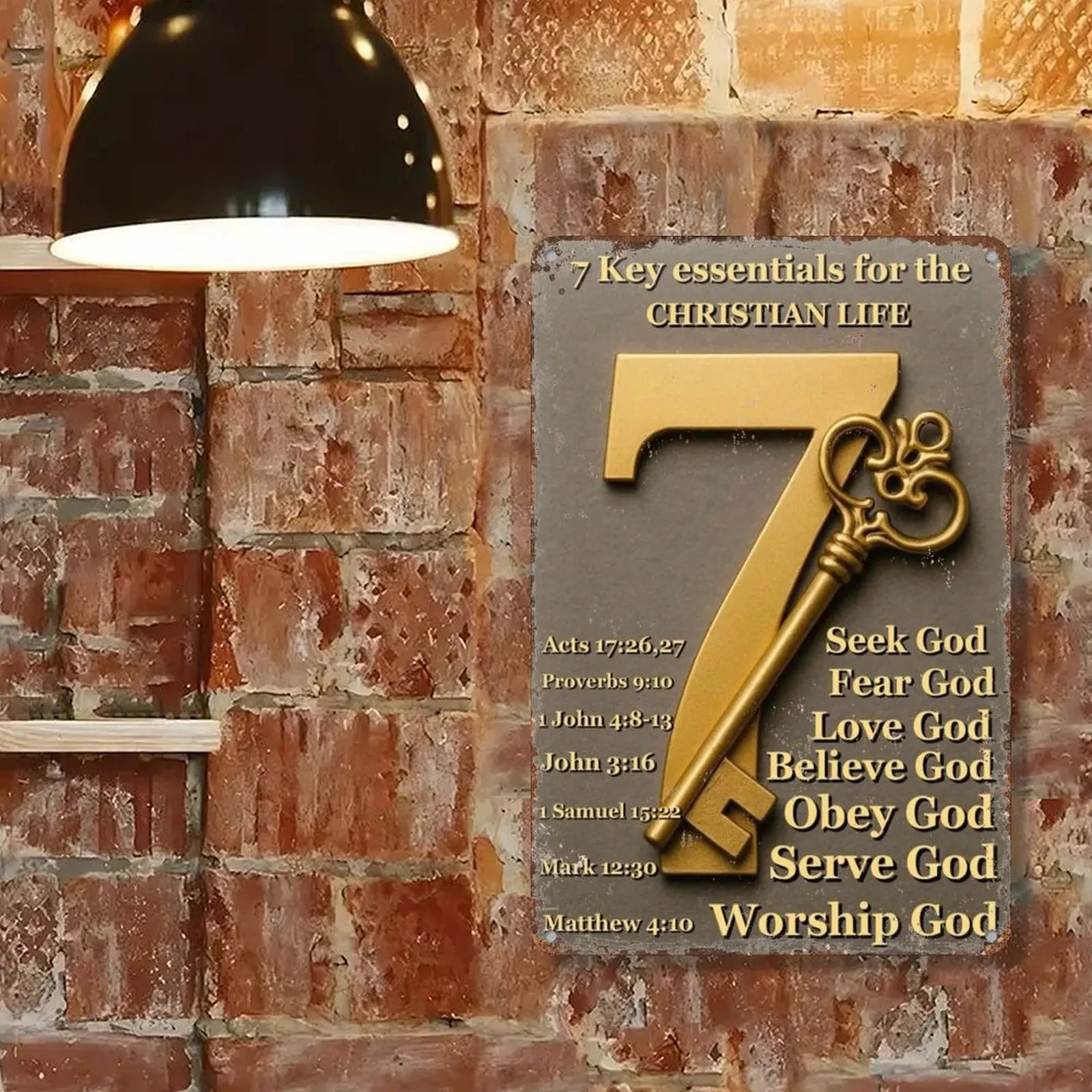 7 Key Essentials For The Christian Life 7 Golden Key Metal Sign - 8x12 Inch Retro Aluminum Wall Decor for Church, Sunday School - Religious Gift for Faith Growth